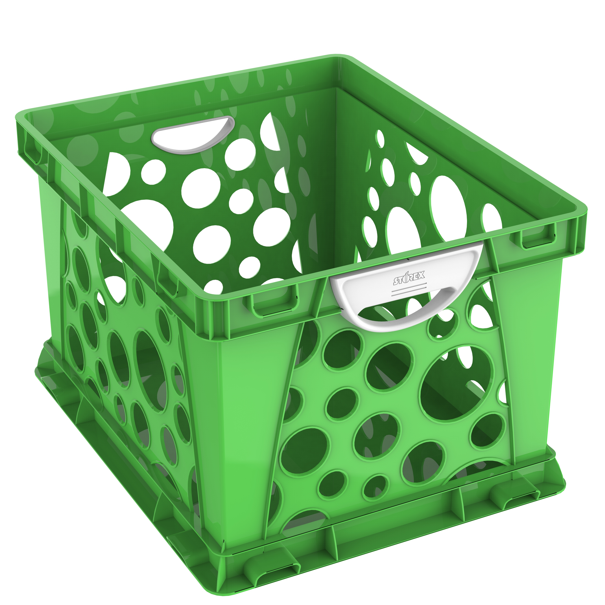 Large crate made of sturdy plastic with 2 handles for easy transport. It features the interlocks on all 4 sides to organize your workspace efficiently. 17.25 x 14.25 x 10.5 inches.