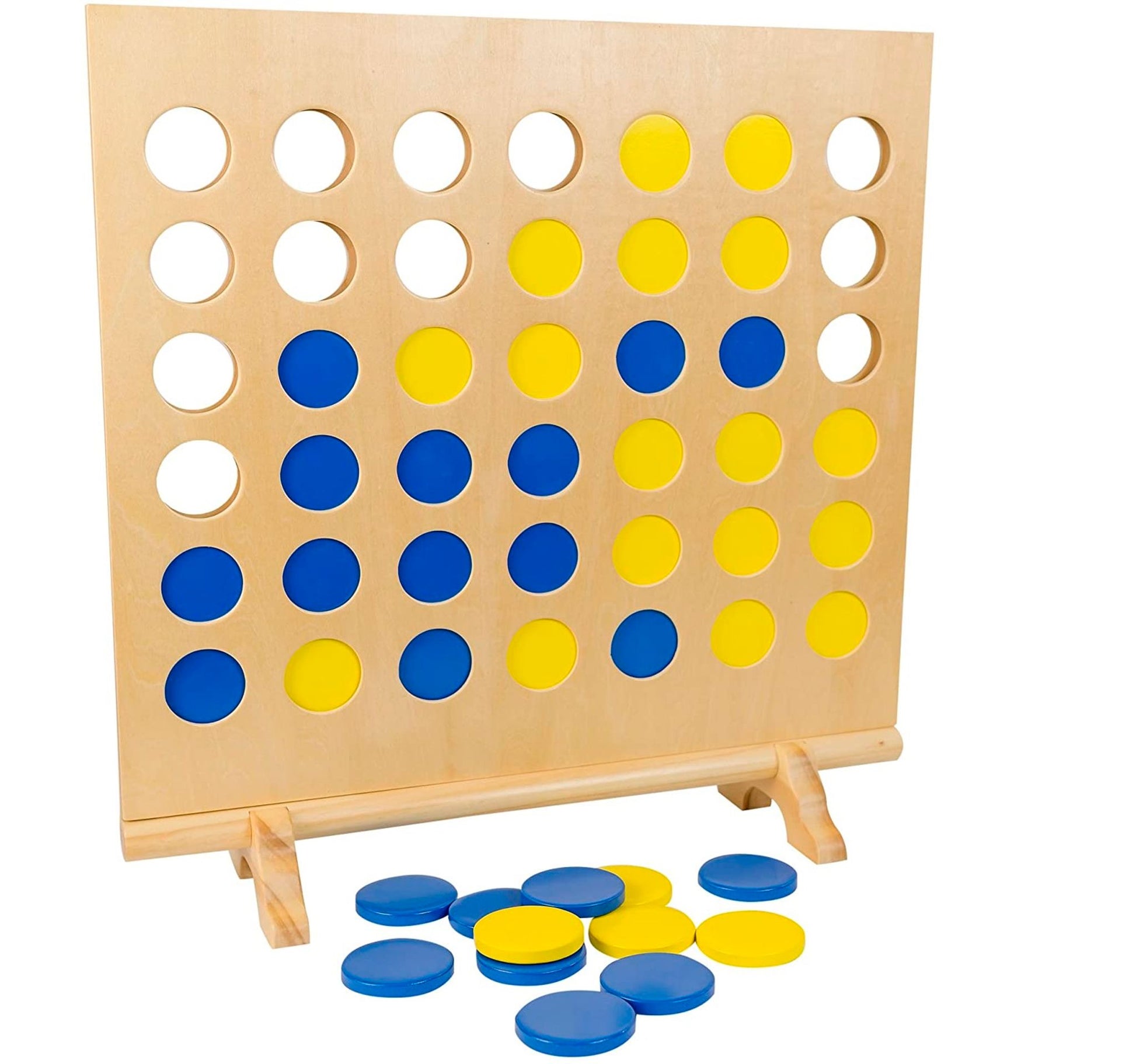 Jeu classique de puissance 4 en version grand format de 50 x 46 cm en bois. Il suffit de faire glisser des jetons dans le cadre pour réaliser un alignement de 4 à l'horizontale, à la verticale ou en diagonale pour gagner. On bascule le cadre pour sortir les jetons. Inclut 21 gros jetons de chacune des 2 couleurs et 1 sac de rangement en coton pour les jetons.