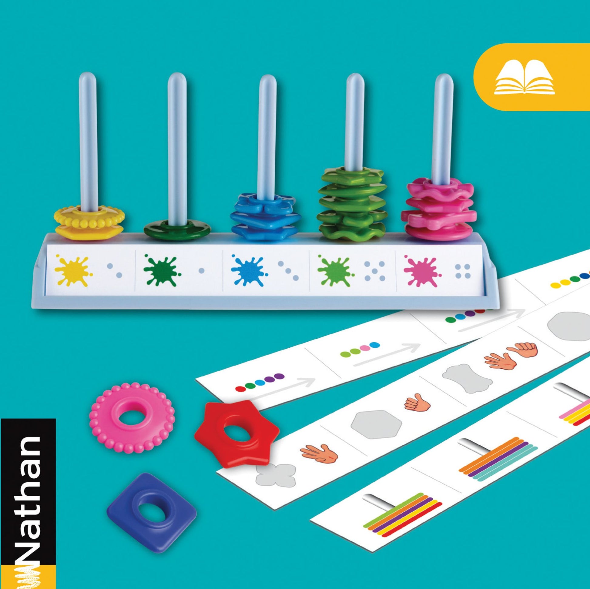 En manipulant des perles de 10 formes et 10 couleurs différentes, les enfants lisent et organisent logiquement l'information, tout en découvrant des activités élémentaires de numération. Offre 2 abaques en plastique à 5 tiges, de 26 x 8 x 12 cm, 87 perles variées de 4 cm, 42 fiches d'activités progressives (7 séries de 6 fiches). 4 ans +
