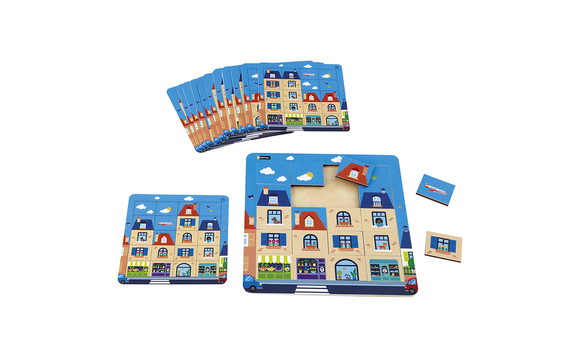 Ensemble de 2 puzzles à solutions multiples avec fiches d'activités de difficulté progressive. Permet de développer l'observation, le repérage spatial, la logique et le vocabulaire topologique. Inclut 1 plateau en bois de 21 x 21 cm, 2 puzzles identiques de 20 morceaux, 12 fiches autocorrectives recto verso et 1 guide pédagogique. 2 enfants.