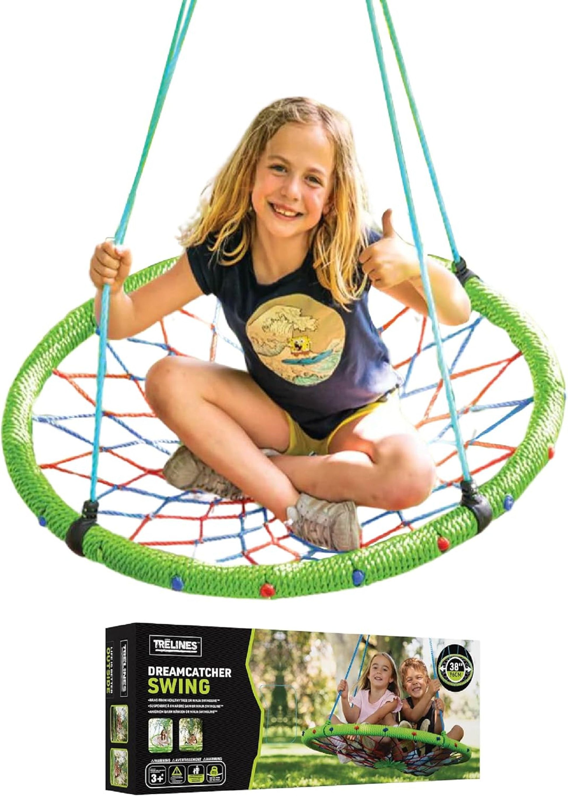 Avec ses couleurs attrayantes, la balançoire capteur de rêves est idéale pour les moments de détente en plein air. Son siège soucoupe de 38 pouces de diamètre convient aux enfants de toutes les tailles. Une corde de 64 pouces et 2 mousquetons verrouillables sont inclus pour permettre l'installation sur une branche d'arbre.