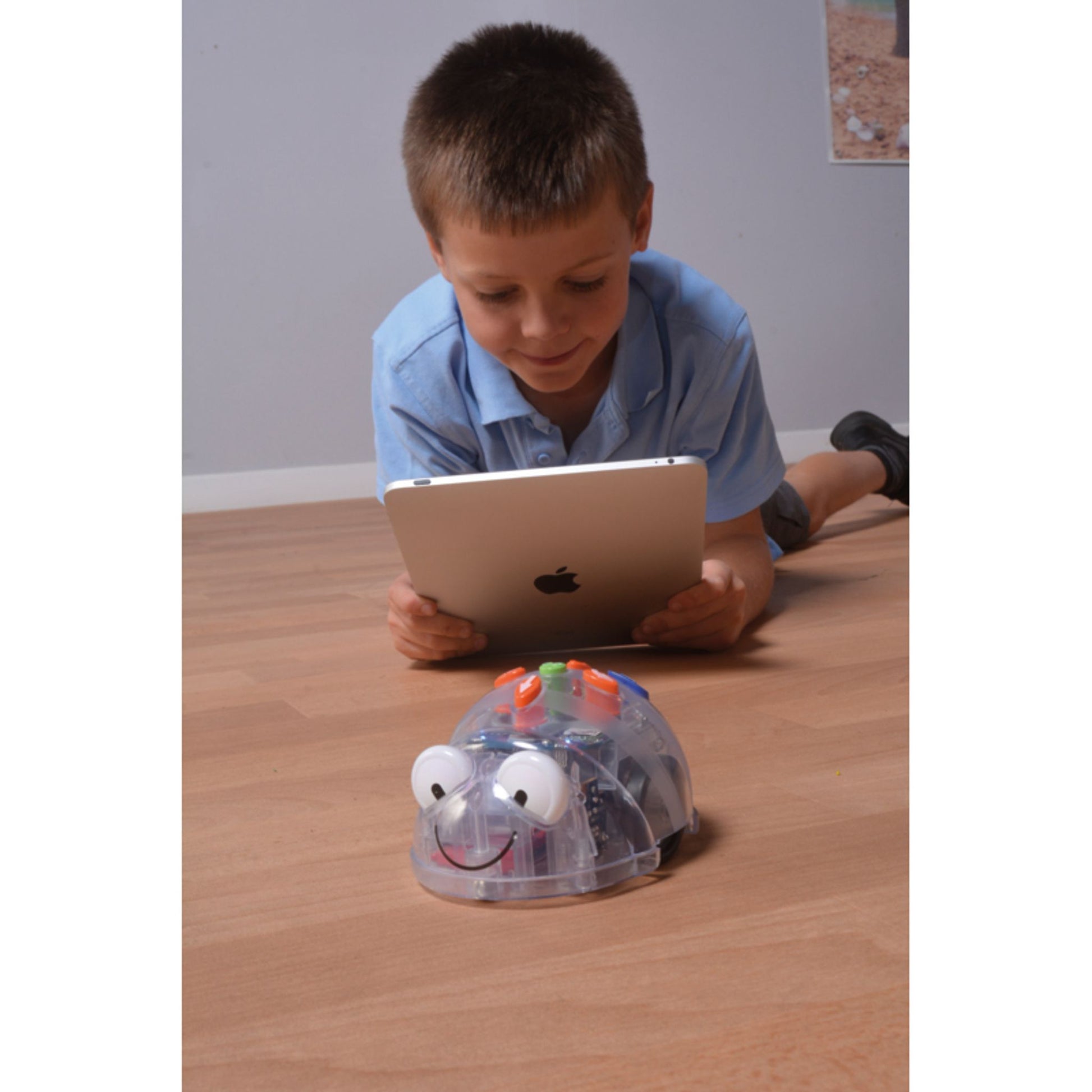 • Semblable au robot-abeille Bee-Bot. • Amène les élèves à développer leurs compétences en programmation, leur esprit logique, ainsi que leur orientation spatiale, et ce, tout en s'amusant. Il se charge par l'ordinateur, avec le câble USB compris, ou à une prise murale avec un adaptateur (non compris). • Se programme de 2 façons : . à l'aide des boutons sur le dessus de sa coquille transparente (déplacements par pas de 15 cm et rotations par tranches de 90 degrés) . à distance, grâce à la technologie Bluetooth, en téléchargeant l'application gratuite disponible pour iOS, Android, Windows et MacOS (en anglais seulement) • Pile rechargeable. • S'utilise sur les mêmes surfaces de défis que Bee-Bot.