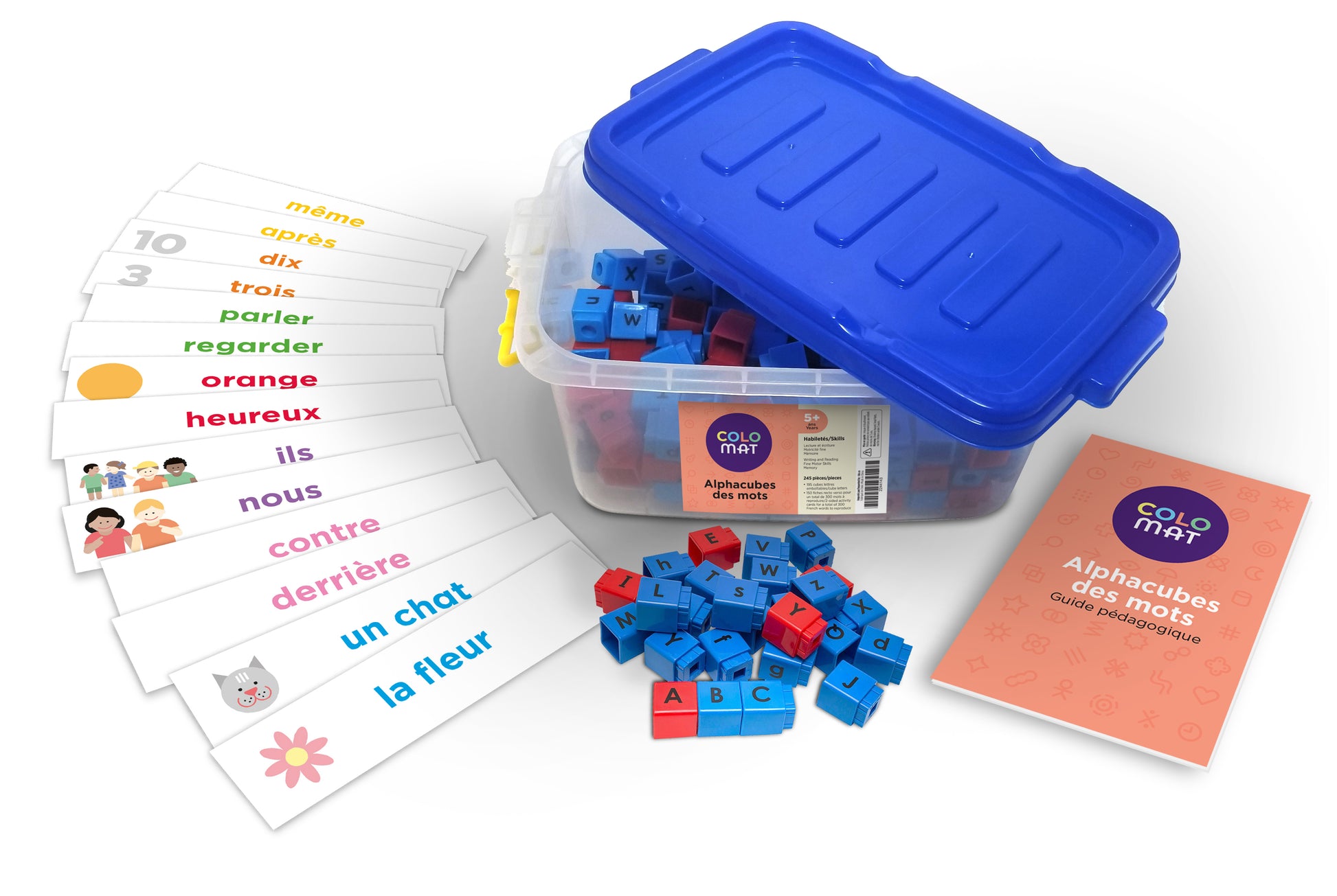 Matériel conçu pour que l'enfant découvre et recompose les 300 mots illustrés représentés sur les fiches modèles de difficulté progressive (mots de 2 à 10 lettres) divisées en classes de mots selon un code de couleur. Regroupe 195 cubes-lettres emboîtables, 130 lettres (de a à z), 25 voyelles supplémentaires, 40 lettres accentuées, 150 fiches recto verso plastifiées et 1 guide pédagogique. Dans un bac de rangement. De 1 à 4 joueurs.
