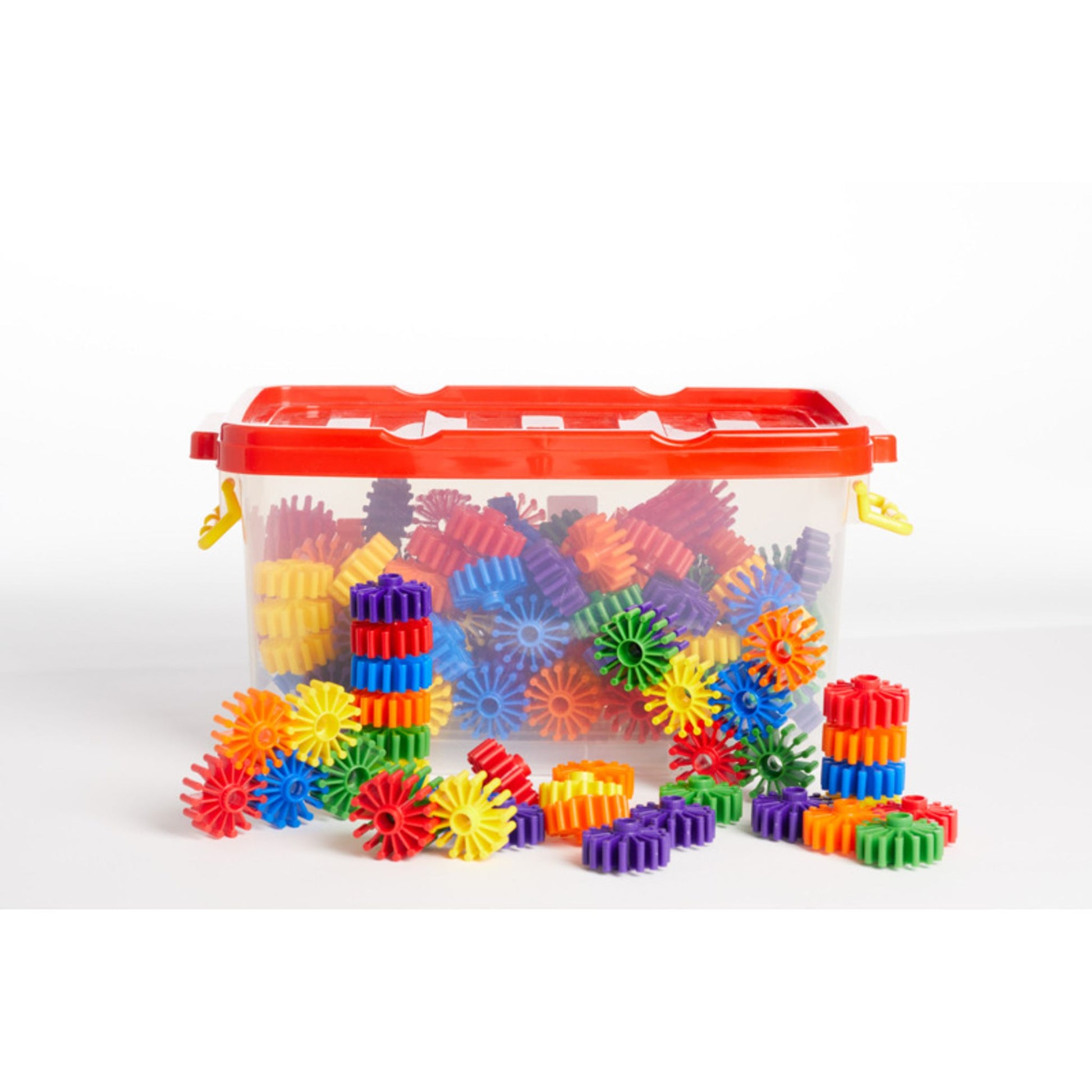 Un seul modèle de pièces rondes en plastique, sur le modèle d'engrenages, qui s'assemblent l'une à l'autre, à plat ou en hauteur pour réaliser de jolies constructions à 2D ou à 3D. Inclut 192 pièces de Ø 4 cm, dans un bac en plastique transparent empilable à 2 poignées.
