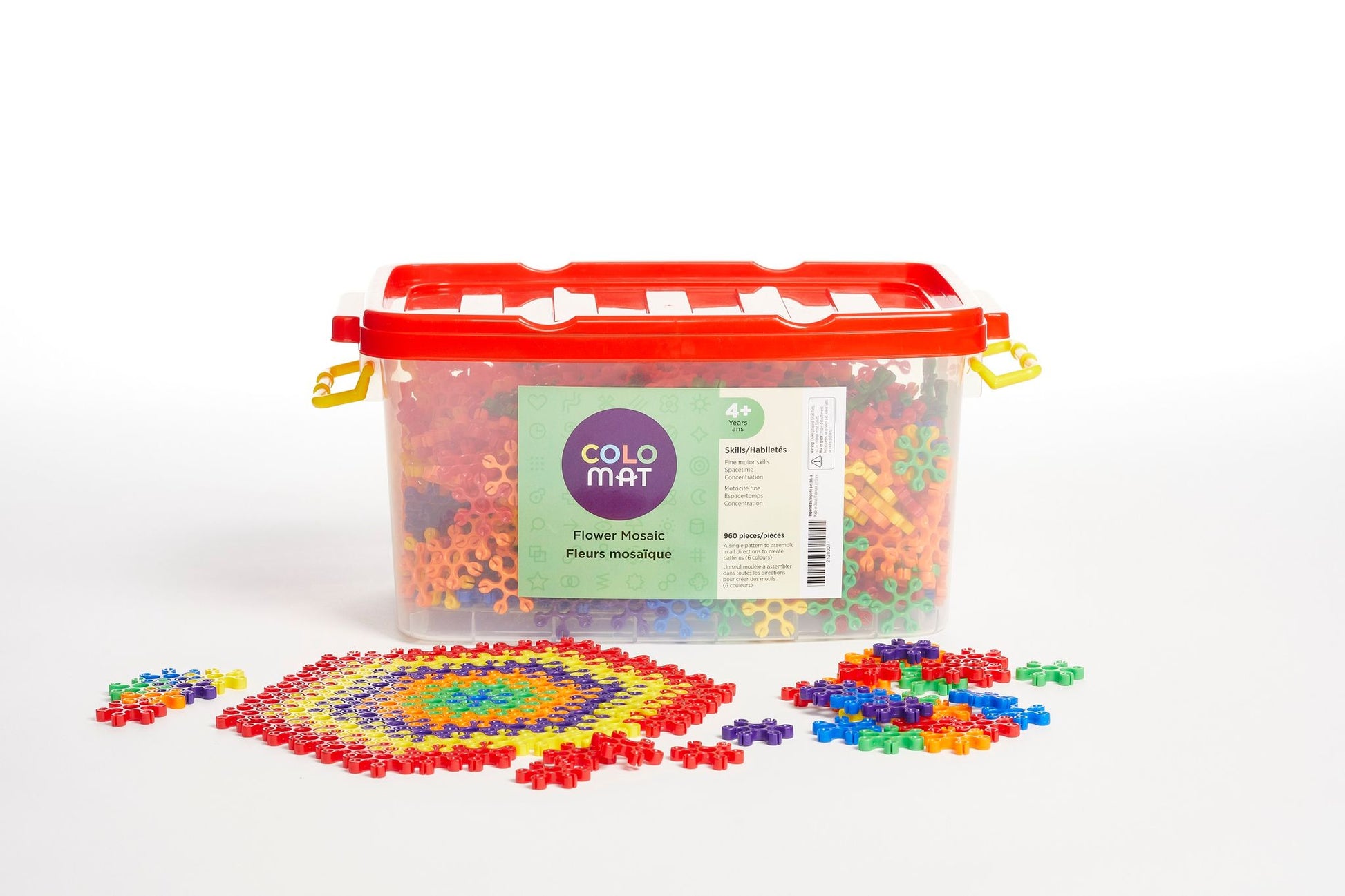Une seule forme de pièces en plastique, en 6 couleurs, qu'on insère les unes dans les autres, dans n'importe quelle direction, pour créer de jolis motifs. Pièces de Ø 3,6 cm. Inclut 960 pièces dans un bac en plastique.