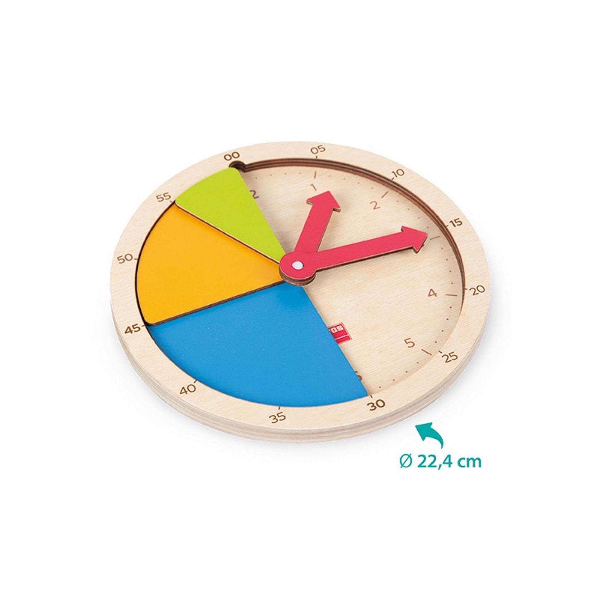 Jeu de pièces colorées à insérer dans une grande horloge, pour diviser une heure en segments de 5, 15 et 30 minutes. Inclut 1 horloge indiquant les heures et les minutes (ø 22,4 cm), 12 pièces de 5 min, 4 de 15 min., 2 de 30 min et 2 aiguilles. Tout bois.