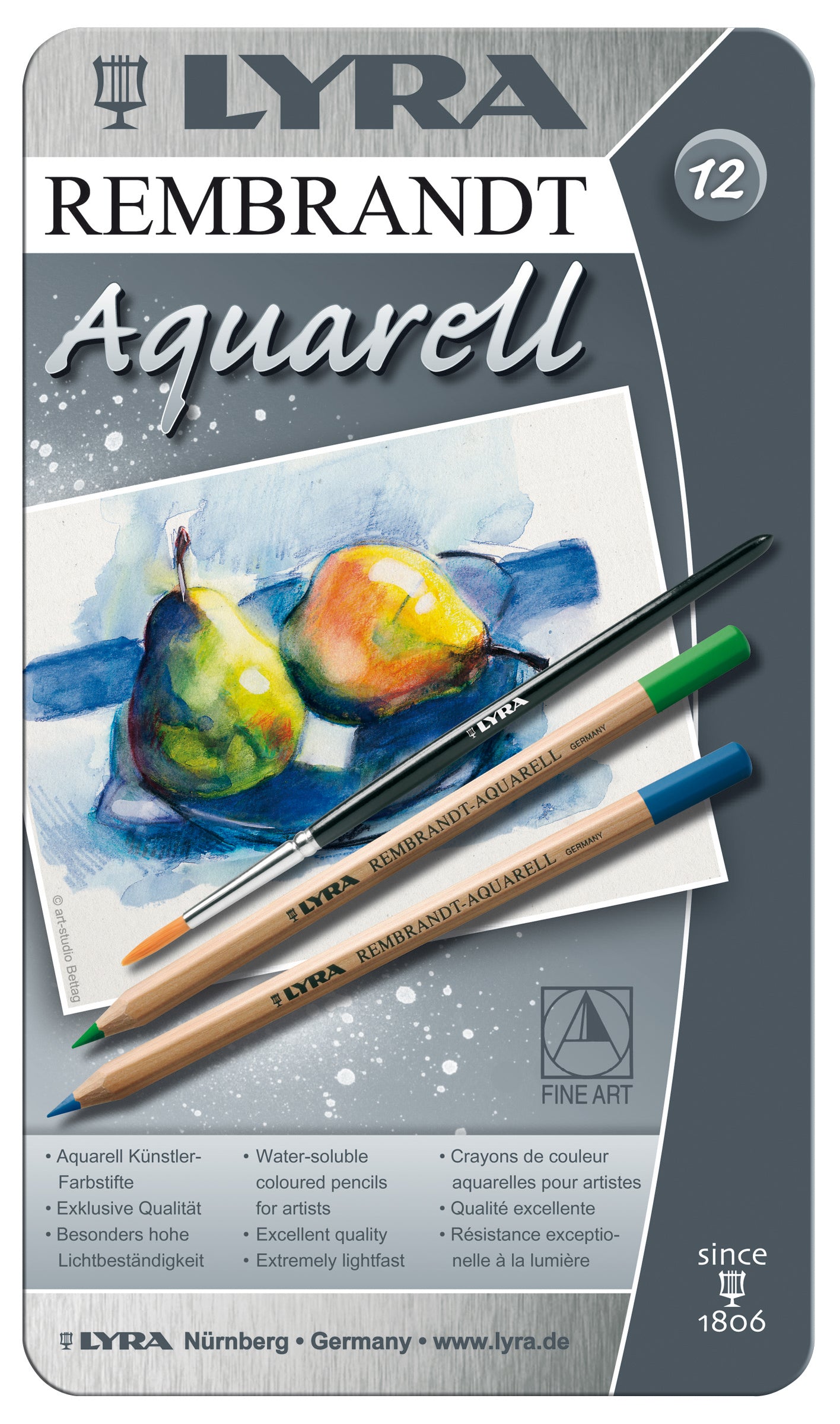 Une haute concentration de pigments rend les couleurs très résistantes à la lumière. Les lignes ou les surfaces peuvent se fondre partiellement ou totalement, avec un pinceau imbibé d'eau, pour créer de riches nuances. Mines de ø 4 mm. Dans un boîtier en métal.