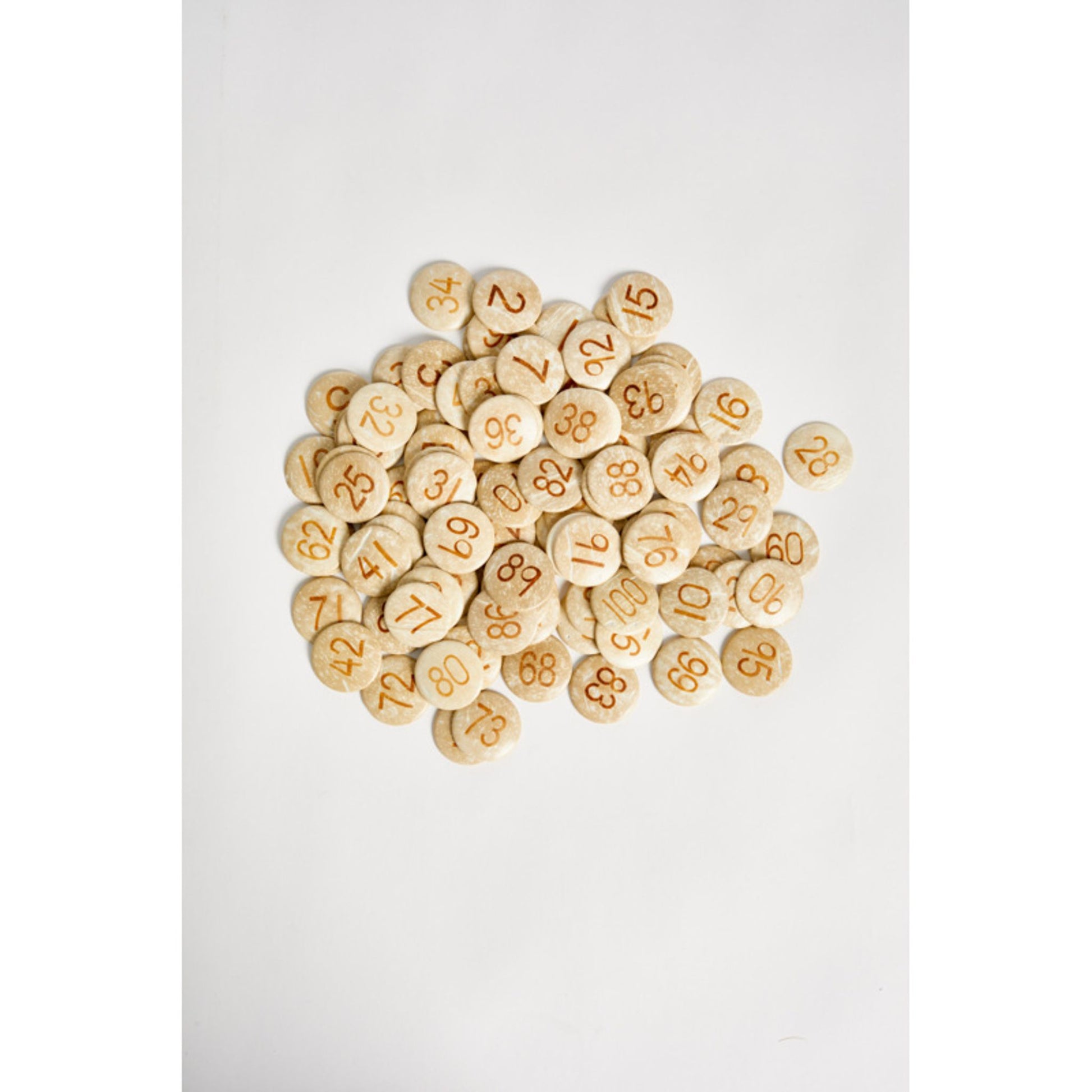 Jeu de 100 disques faits de coquilles de noix de coco ultrarobustes, polies et concaves, aux nombres de 1 à 100 gravés sur les surfaces lisses et non toxiques. Convient à l'enseignement à l'extérieur. Ø 2,54 cm.
