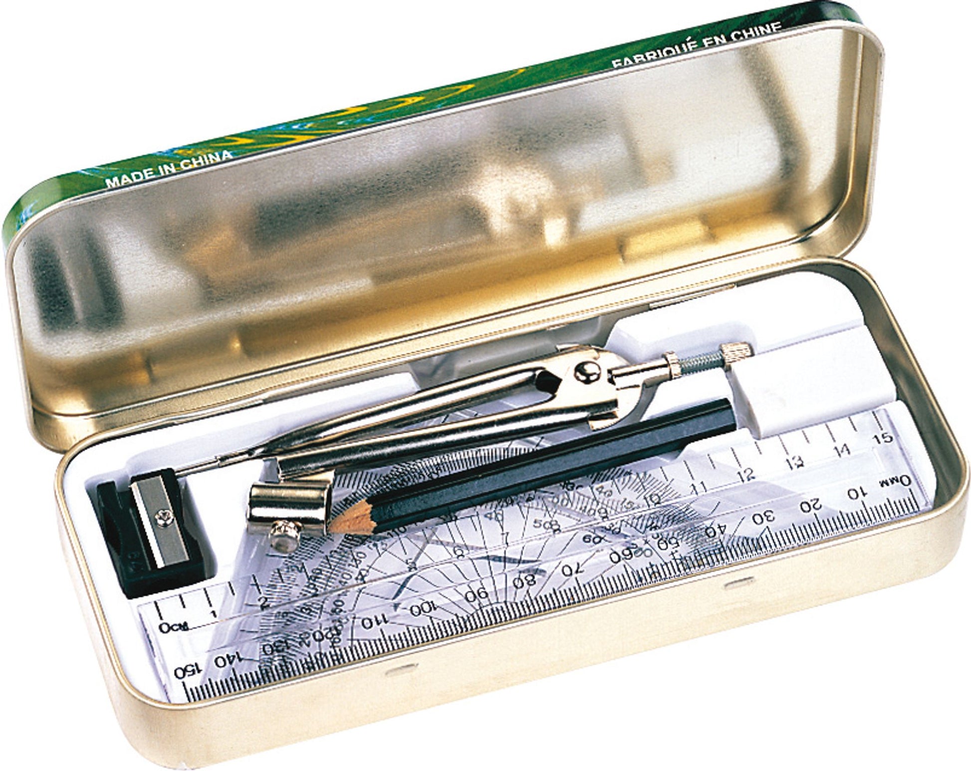 9 pièces : compas, règle, équerres 30°/60° et 45°/90°, rapporteur d'angles et crayon. Dans une boîte en métal.