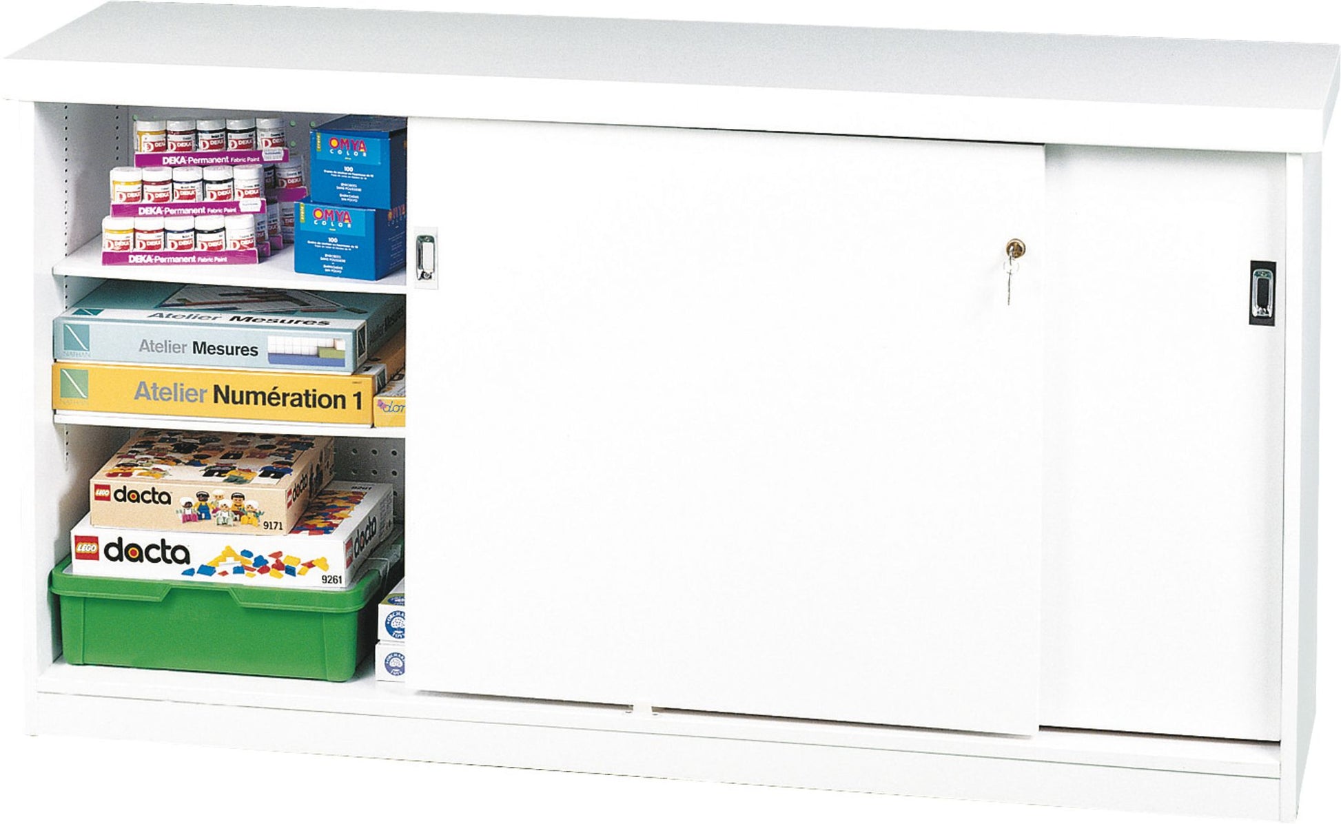 Meuble de rangement à verrou avec 2 portes coulissantes et 4 tablettes réglables. En bois, avec dessus stratifié et dos en Masonite de 3 mm d'épaisseur. Sur roulettes pivotantes. 152 x 40 x 82 cm de haut.