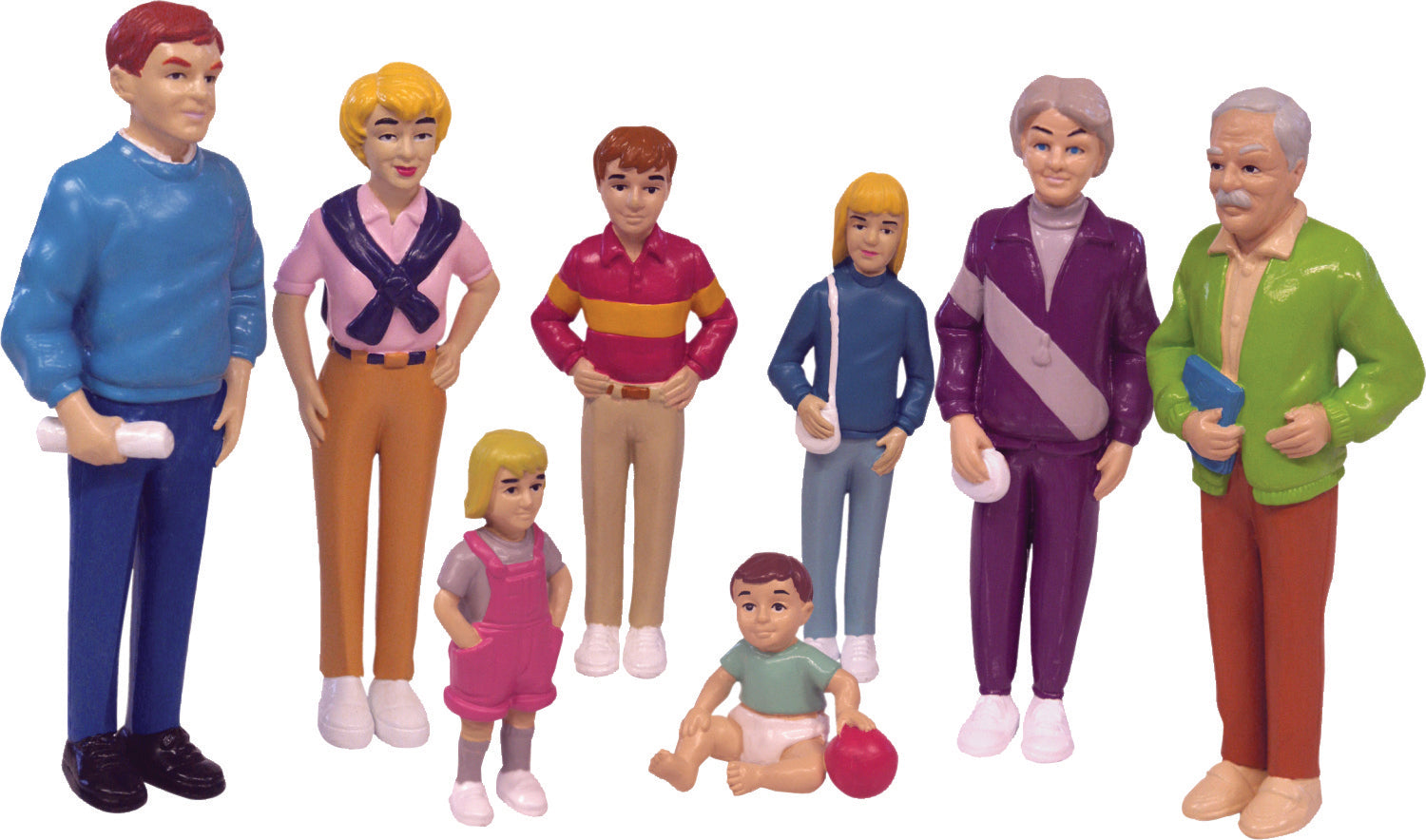 Figurines en plastique rigide, peintes à la main, représentant 3 générations d'une famille: grands-parents, parents et 4 enfants, dont 1 bébé. Les figurines, aux détails réalistes, tiennent bien debout et ont un objet à la main pour enrichir le jeu. Père: 13 cm de hauteur.