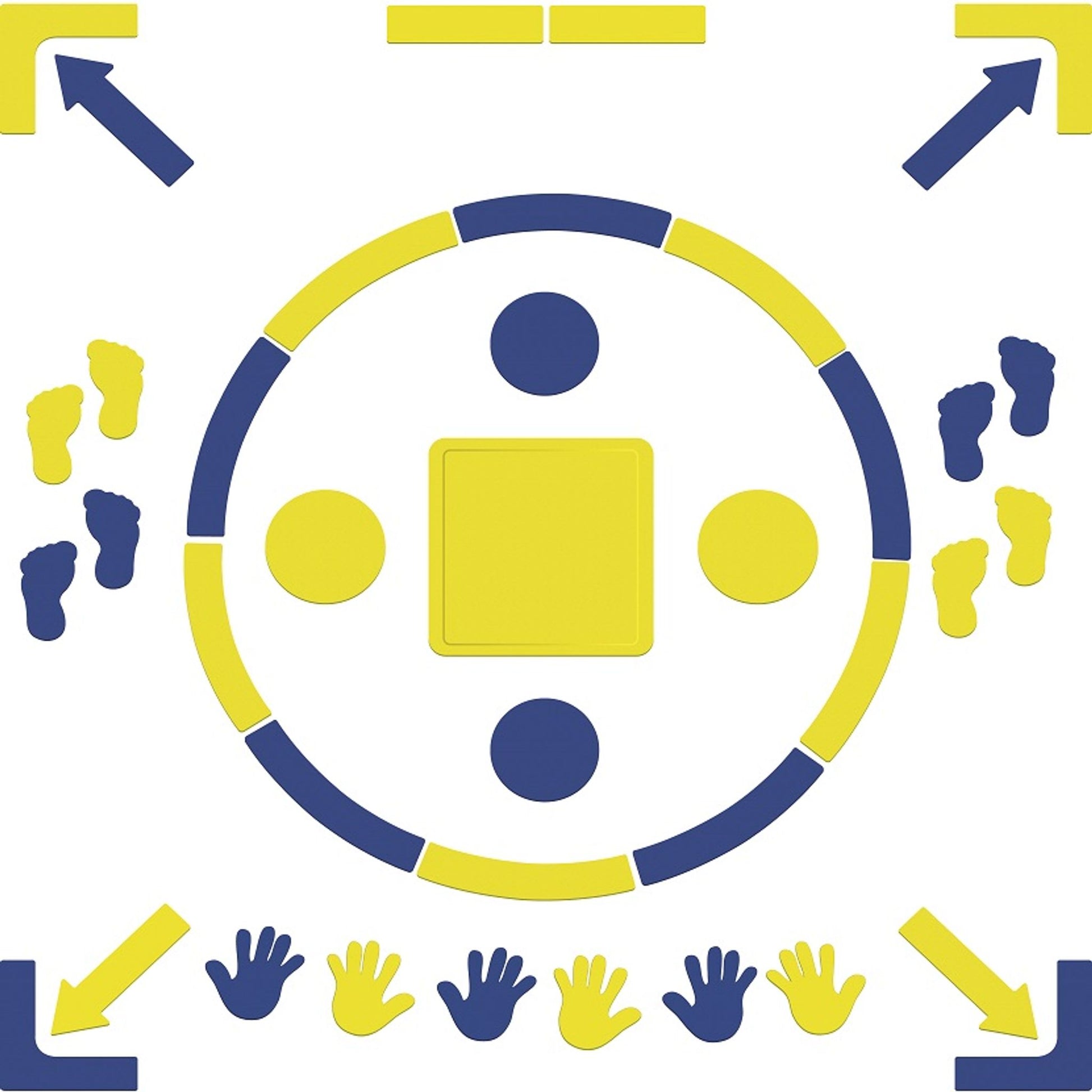 Ensemble de 39 pièces, idéal pour les jeux de mouvement et de coordination, pour réaliser des parcours, créer des lignes et délimiter des espaces de jeu. Inclut 4 coins, 2 lignes rectangulaires, 4 flèches, 1 carré, 10 courbes, 4 cercles, 3 paires de mains et 4 paires de pieds texturés. Caoutchouc antidérapant robuste et coloré. Les flèches font 37 cm de long.