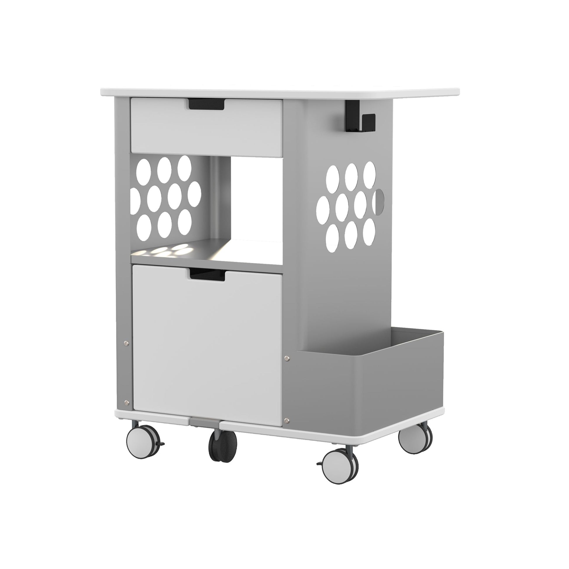 Chariot polyvalent qui permet aux enseignants itinérants de se déplacer avec leur matériel d'un local à l'autre. Offre un tiroir supérieur pour les fournitures de bureau et un tiroir inférieur pour les chemises suspendues de format légal ou lettre, un compartiment de rangement latéral pour les articles personnels, un crochet où suspendre un sac ou un manteau et une tablette pour imprimante, télécopieur ou autres fournitures. Sur 5 roulettes en caoutchouc dont 2 à blocage. En acier plié à revêtement par poudrage avec dessus en mélamine, Gris.71,1 x 50,8 x 85 cm de haut. Assemblage requis.