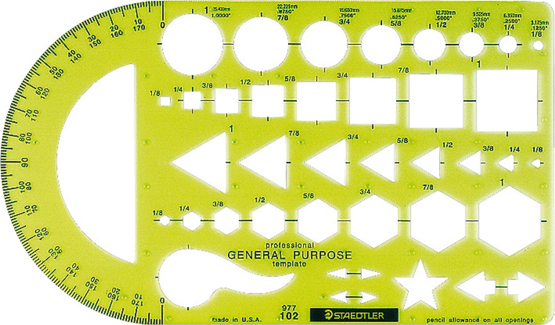 42 figures différentes : cercles, carrés, triangles, etc. Avec dimensions inscrites en fractions avec équivalences en décimales et millimètres. 24 x 14 cm.