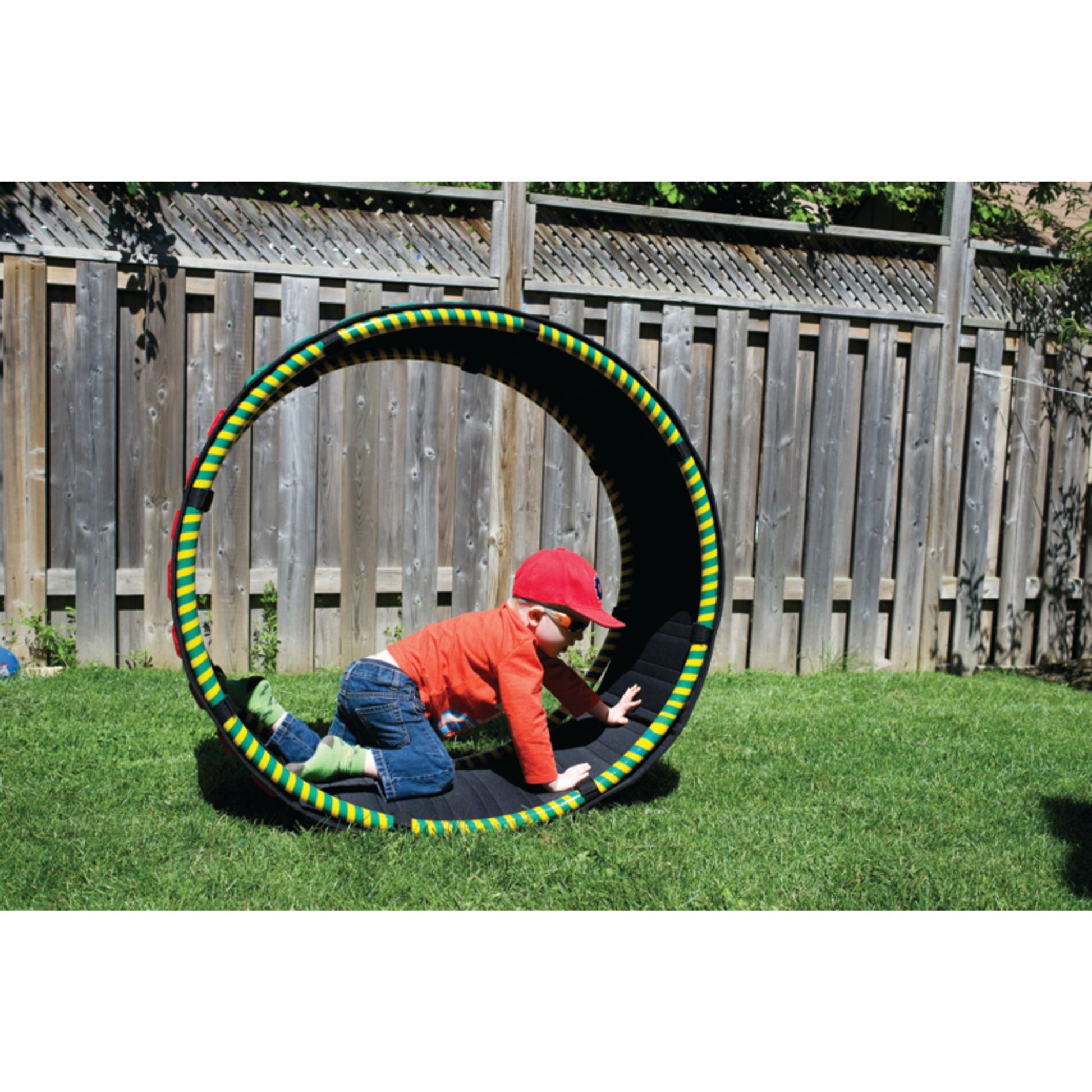 Roue géante faite de deux cerceaux en plastique ultrarobustes attachés par des bandes de Velcro de part et d'autre d'une structure circulaire en nylon épais rembourré de bandes en mousse dense. Parce qu'elle est polyvalente, les enfants peuvent la faire tourner de l'intérieur en y marchant à quatre pattes ou de l'extérieur, en la poussant. Favorise la coordination et l'équilibre. Pour le jeu à l'intérieur ou à l'extérieur sur le gazon ou une surface caoutchoutée. ø 86 cm.