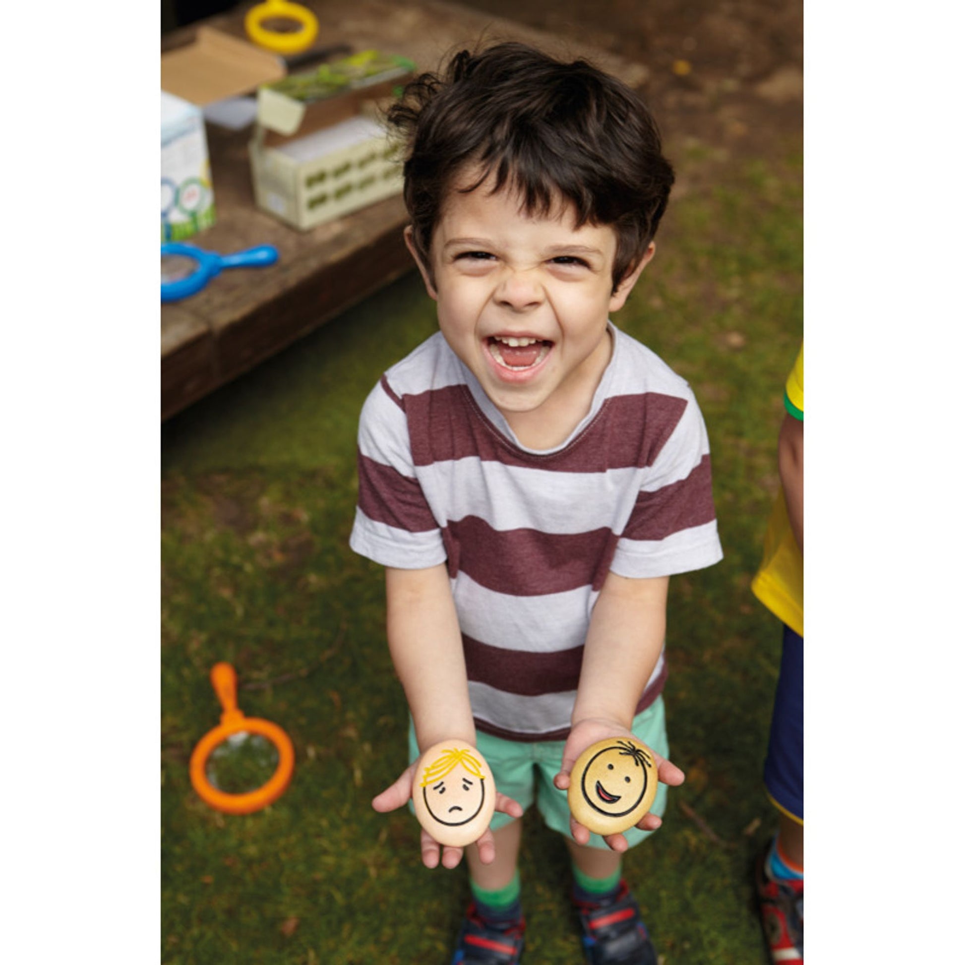 Ensemble de 8 gros galets aux traits gravés, parfaits pour les petites mains. Illustrent les 4 émotions que les enfants identifient et vivent le plus aisément (joie, tristesse, surprise et colère) en 2 exemplaires chacune, pour les activités de pairage. Durables et lavables. Moulés dans un mélange pierreux permettant l'utilisation en plein air et dans le sable et l'eau. Env. 7 cm.
