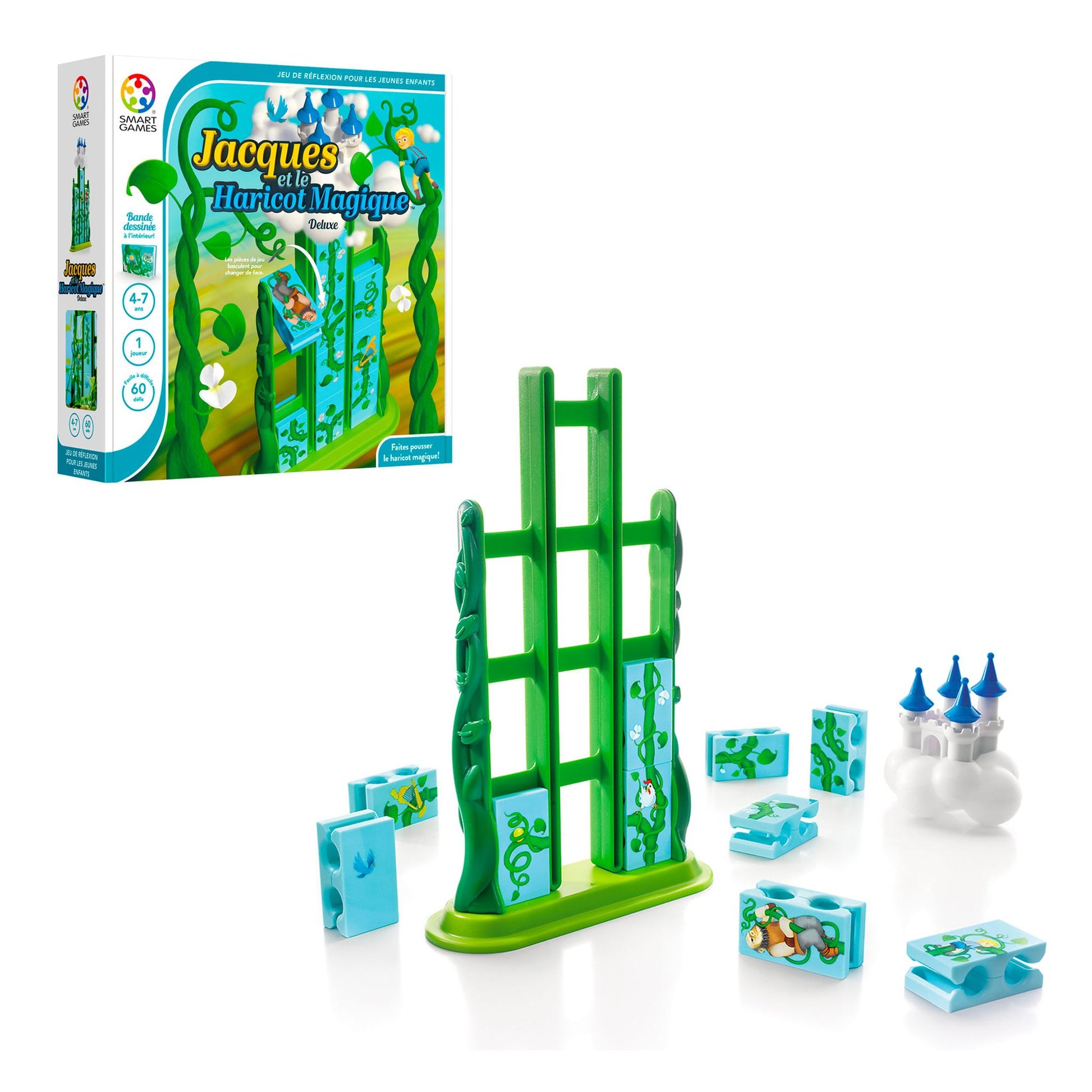 Pour reproduire le haricot géant illustré sur la carte, il faut faire coulisser par le haut les plaques qui, aléatoirement, pivotent en descendant de l'autre côté. Inclut 1 haricot, 1 château, 60 défis progressifs avec les solutions (avec et sans le géant) et 1 charmant livre illustré du conte original. 1 joueur.