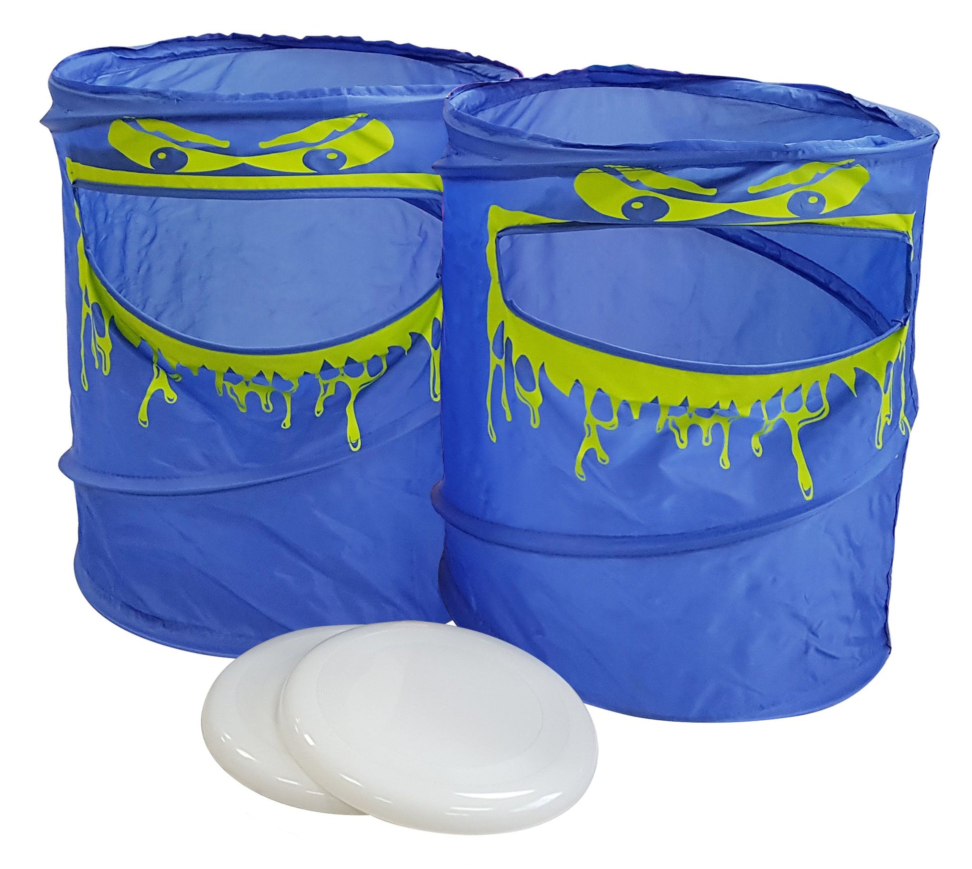 Quelle équipe réussira à faire entrer le plus de fois les disques volants dans la bouche des monstres à la bouche et aux yeux phosphorescents ? Ce jeu peut s'utiliser dans le noir puisque certaines pièces brillent dans le noir. La partie phosphorescente entourant l'ouverture de la cible en facilite l'atteinte. Comprend 2 grands seaux phosphorescents en nylon, 2 disques volants et un sac de transport. Se replie et se range facilement dans le sac de transport. Mesure du seau : 50,8 cm de haut ⌀ 38, 1 cm.