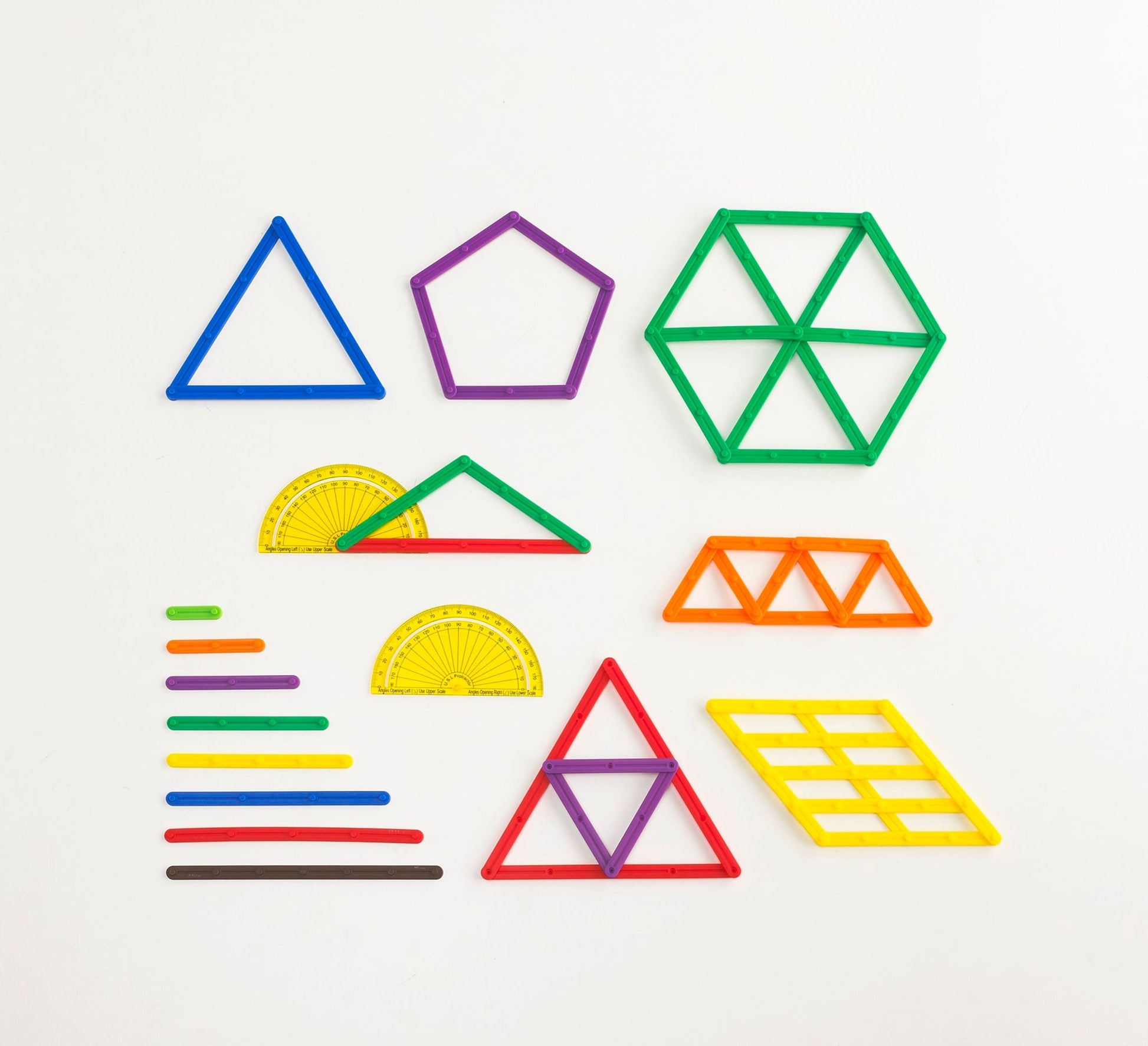 Aide visuelle conçue pour enseigner la mesure des angles et les polygones, en calculer la hauteur et la surface, en trouver le point central et plus encore. Les segments se joignent aisément par pression pour créer des formes. Chaque longueur est représentée par une couleur. Inclut 80 segments de 8 tailles (de 2,5 à 15 cm de longueur, 2 rapporteurs d'angle de 10 cm et un feuillet explicatif (en anglais seulement).
