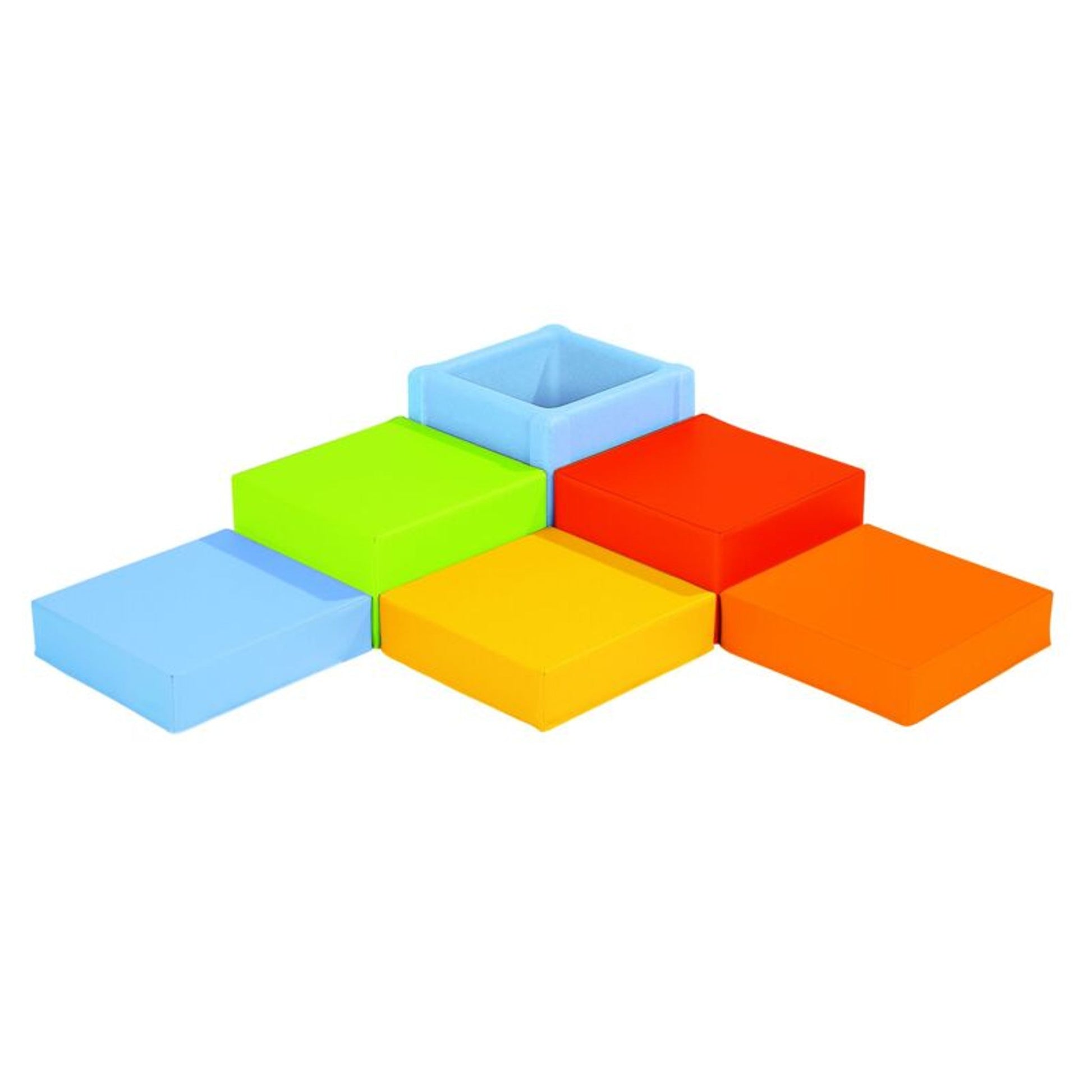 Faits de mousse à haute densité, offrant confort et résistance contre l'affaissement. Recouverts d'une toile en vinyle, ils se nettoient aisément à l'eau. Munis d'un dessous antidérapant, ils s'empilent facilement lors du rangement. Tous ces éléments ont une largeur de 48 cm pour faciliter vos différents agencements. 2 poufs carrés de 25 cm de haut, 3 de 12,5 cm de haut et 1 bac de rangement en plastique épais.