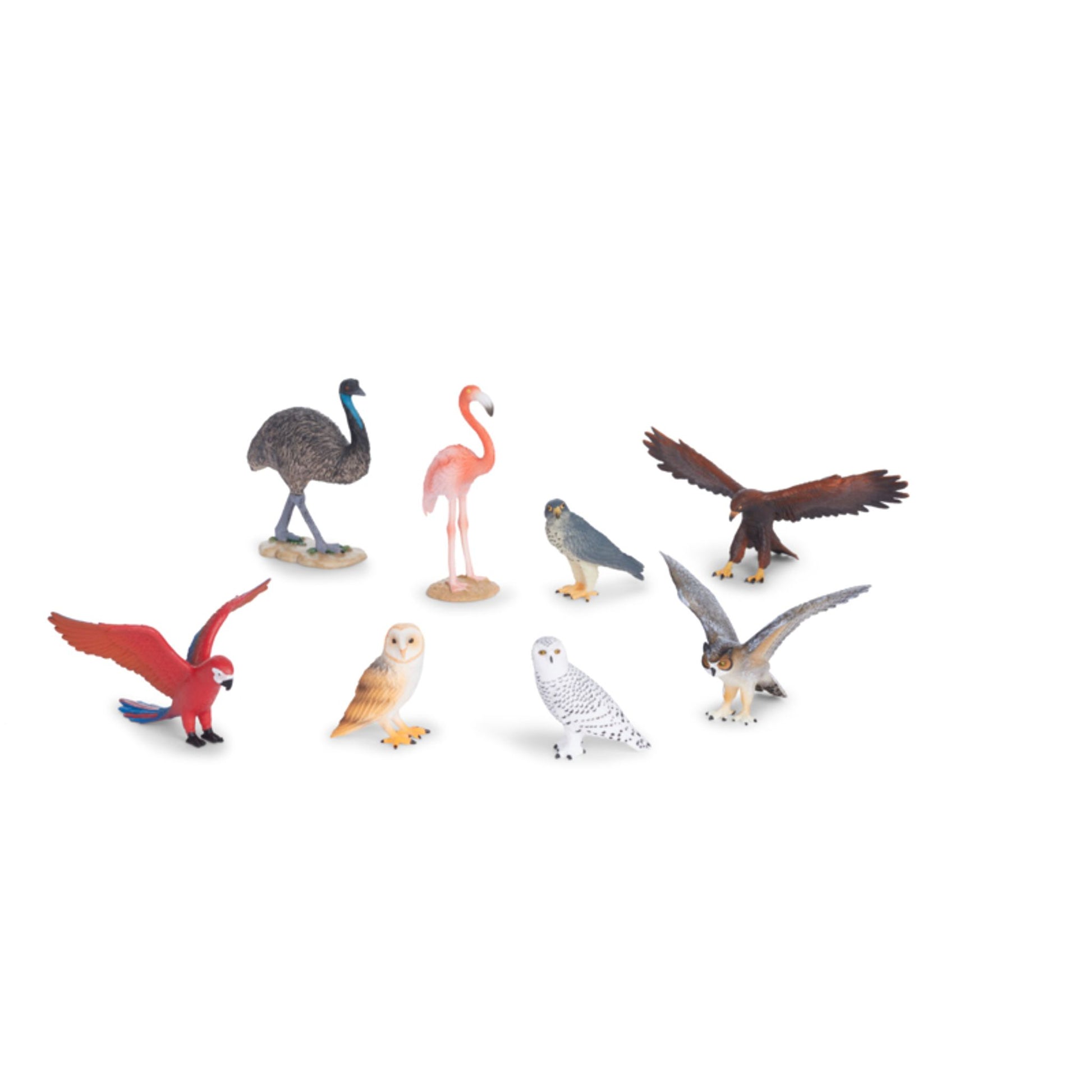 8 oiseaux: faucon pèlerin, perroquet, aigle royal, chouette effraie, grand-duc, émeu, flamand rose, harfang des neiges.