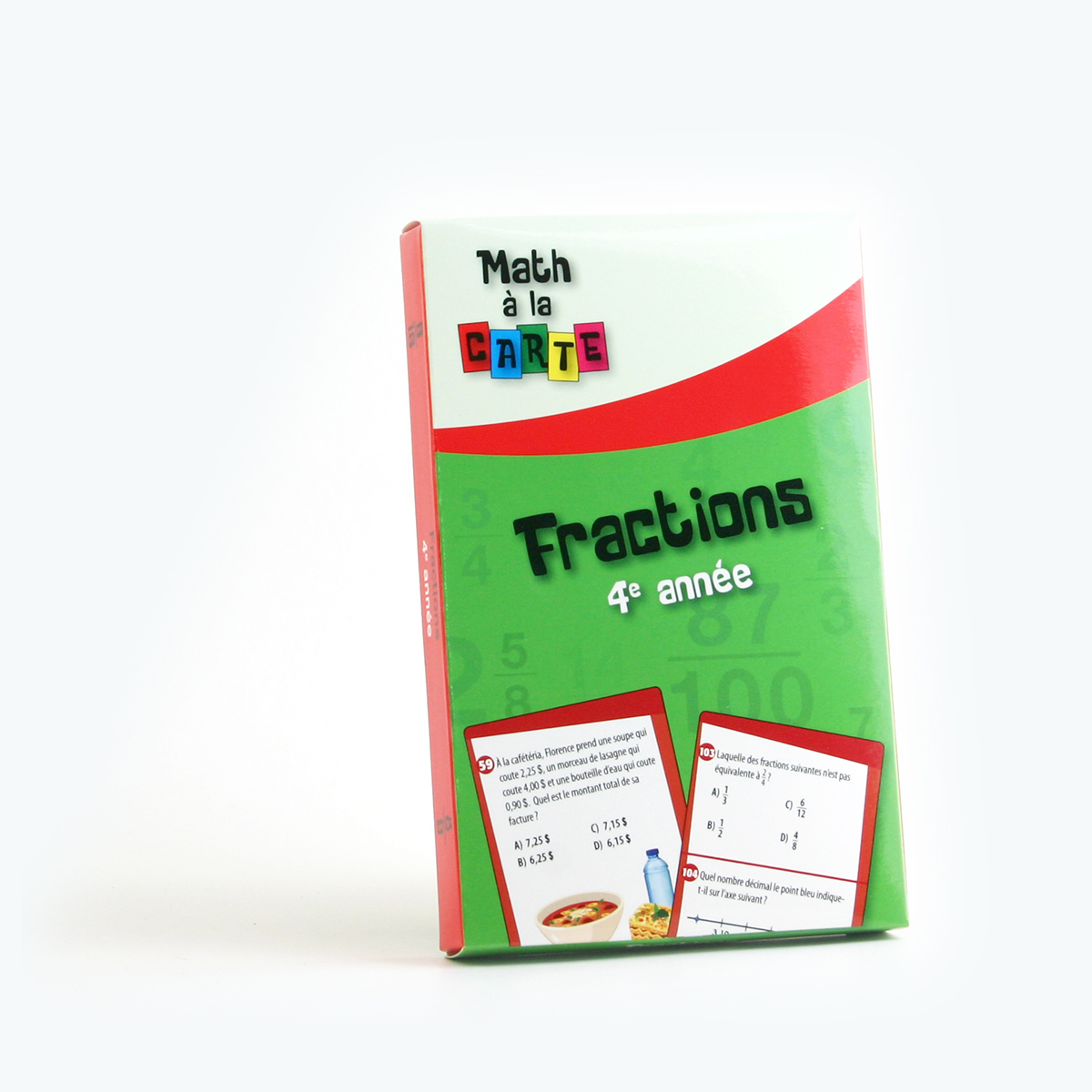 Jeux de 40 cartes présentant 120 questions à choix de réponses, pour aborder les notions de fractions, nombres décimaux et pourcentages. L'enseignant lit les questions à voix haute ou l'élève lit les questions, y répond et se corrige, seul ou en petits groupes. Cartes de 9 x 14 cm.