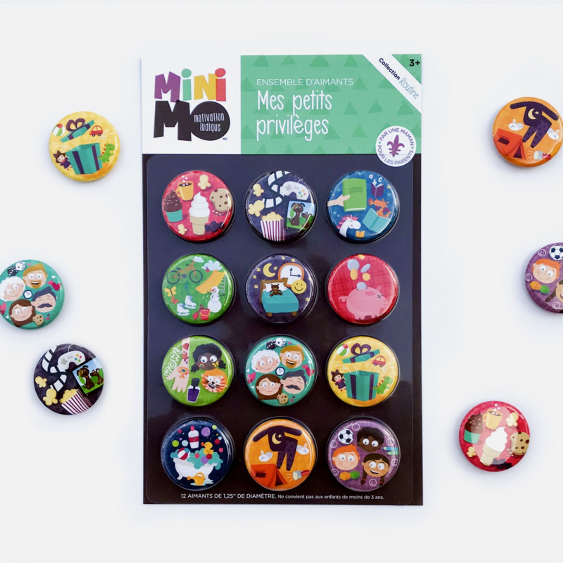 Outil pratico-ludique de célébration des réussites. À afficher sur une surface métallique ou un tableau Minimo (vendu séparément). Jeu de 12 aimants illustrés (repousse-dodo, journée pyjama, etc.) de ø 3,1 cm avec un PDF de coupons privilèges à t ... Afficher plus
