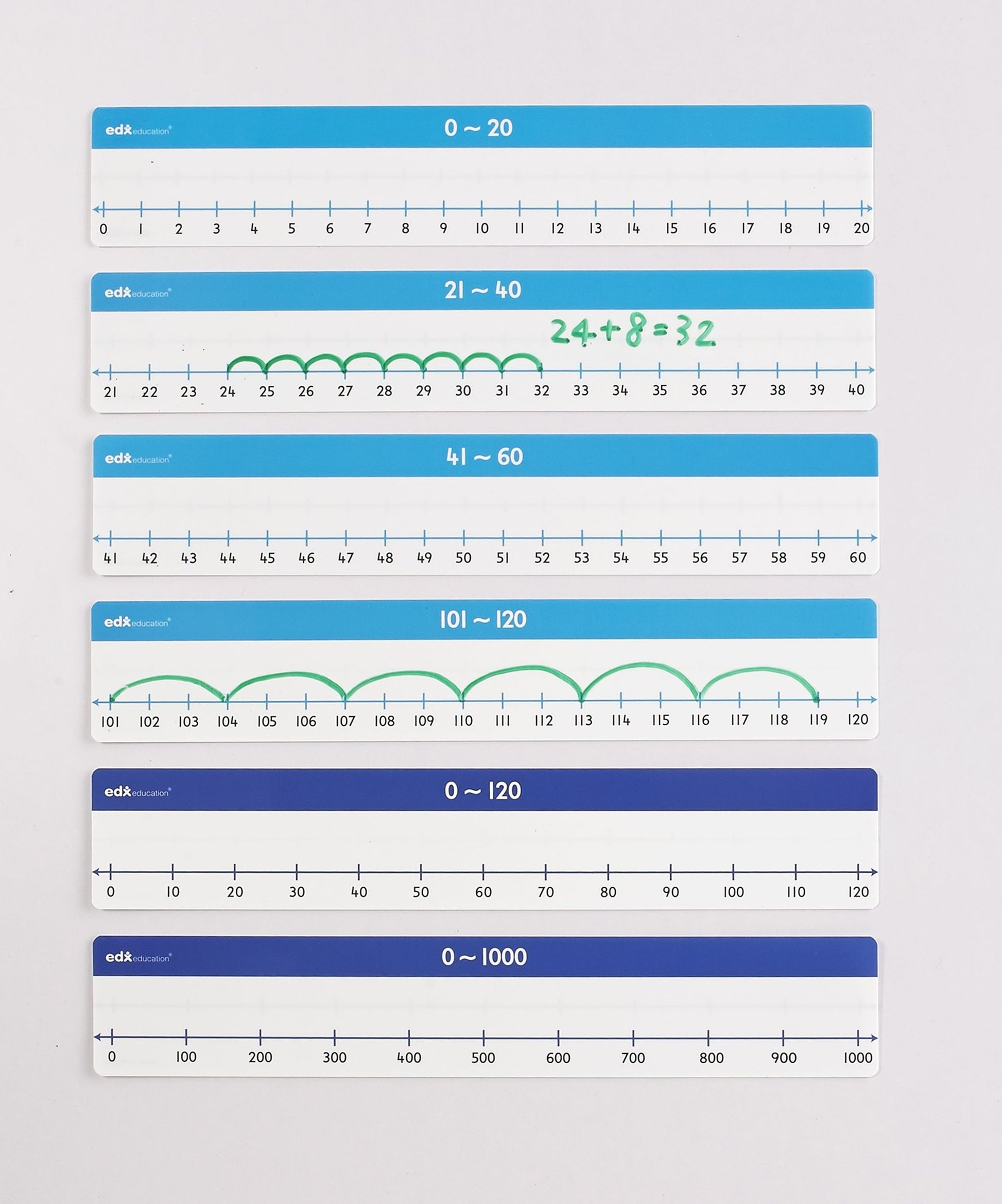 Cet ensemble de droites numériques de table inclut 8 droites allant de 0 à 120 divisées en 6 segments de 20 chiffres chacune, 15 droites allant de 0 à 120 par bonds de 10 et 15 droites allant de 0 à 1000 par bonds de 100. Ensemble de 78 droites de 30,5 x 5,5 cm, en plastique sur lesquelles écrire avec des marqueurs à essuyage à sec (non compris). Droites illustrées de chiffres au recto et vierges au verso.