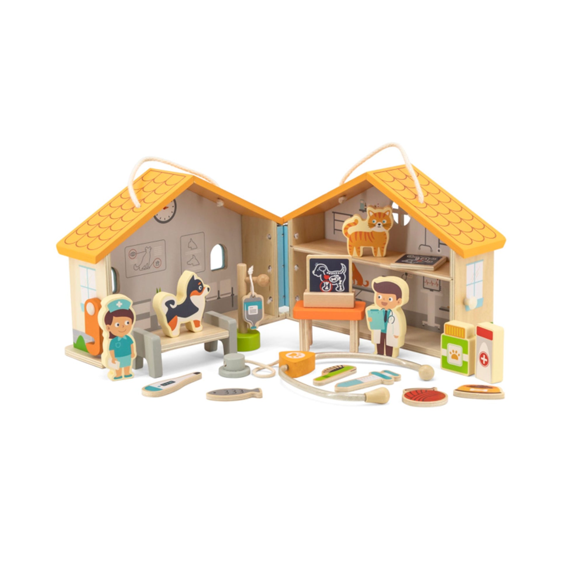 Ce joli hôpital pour animaux comprend 19 solides pièces en bois pour jouer au vétérinaire. On retrouve 1 vétérinaire, 1 infirmière, 1 chat, 1 chien, 1 seringue, 1 peigne, 1 thermomètre, 1 stéthoscope, de la nourriture pour animaux, 1 radiographie, des jouets pour animaux et divers autres accessoires. Toutes les pièces se rangent dans l'hôpital, qui devient une mallette facile à ranger et à transporter.