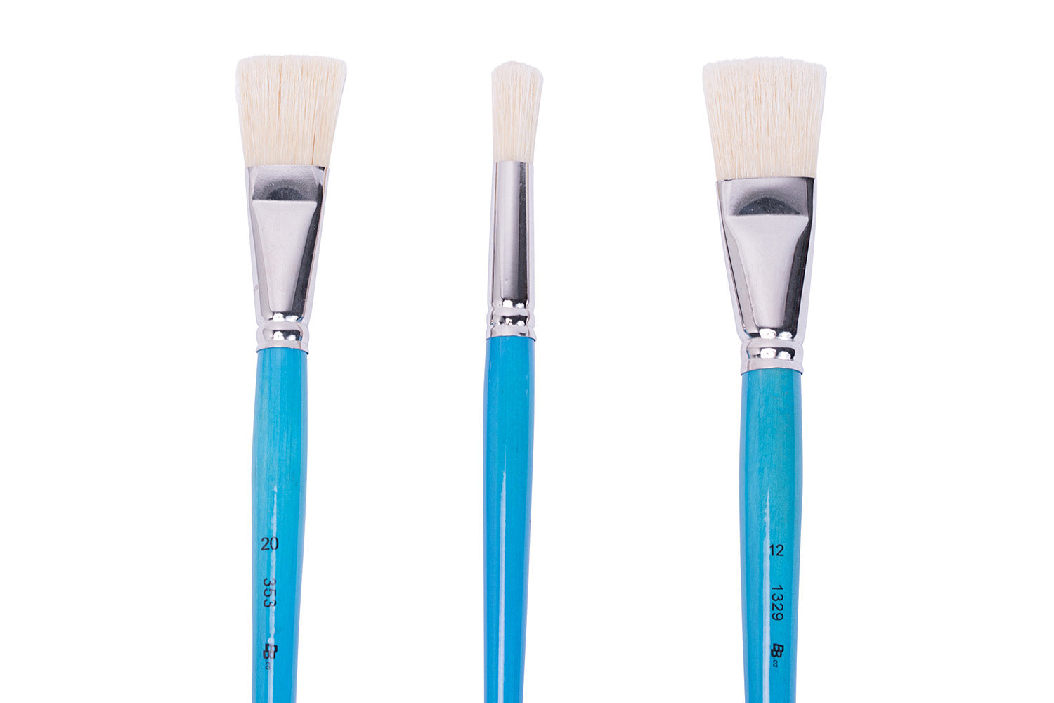 Brosse carrée en soies de porc de qualité Beau-Blanc. Idéale pour les acryliques, huiles et médiums épais et consistants. Manche de 264 mm, teint en bleu B&B et verni. Virole en laiton nickelé.