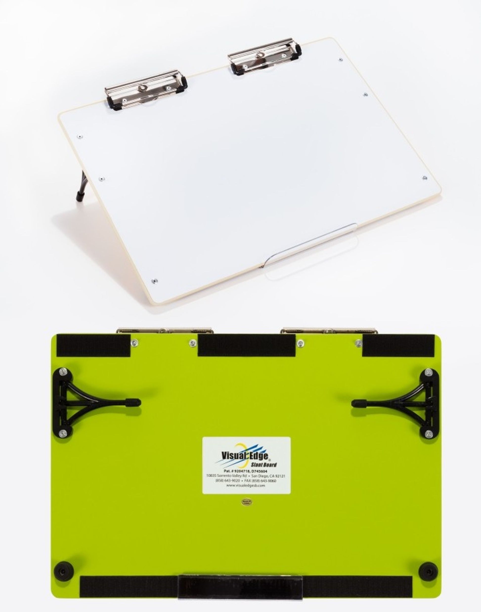 Plan ergonomique incliné à un angle optimal de 22°, conçu pour concentrer le regard sur le texte en favorisant un meilleur balayage visuel, pour réduire la tension dans le cou et améliorer la posture. Idéal autant pour la lecture que l'écriture. Comporte un tableau magnétique à essuyage à sec, pour l'apprentissage multisensoriel, deux pinces supérieures, un rebord inférieur, et des pattes rabattables pour le transport et le rangement. 45,7 x 30,4 cm. Vert.