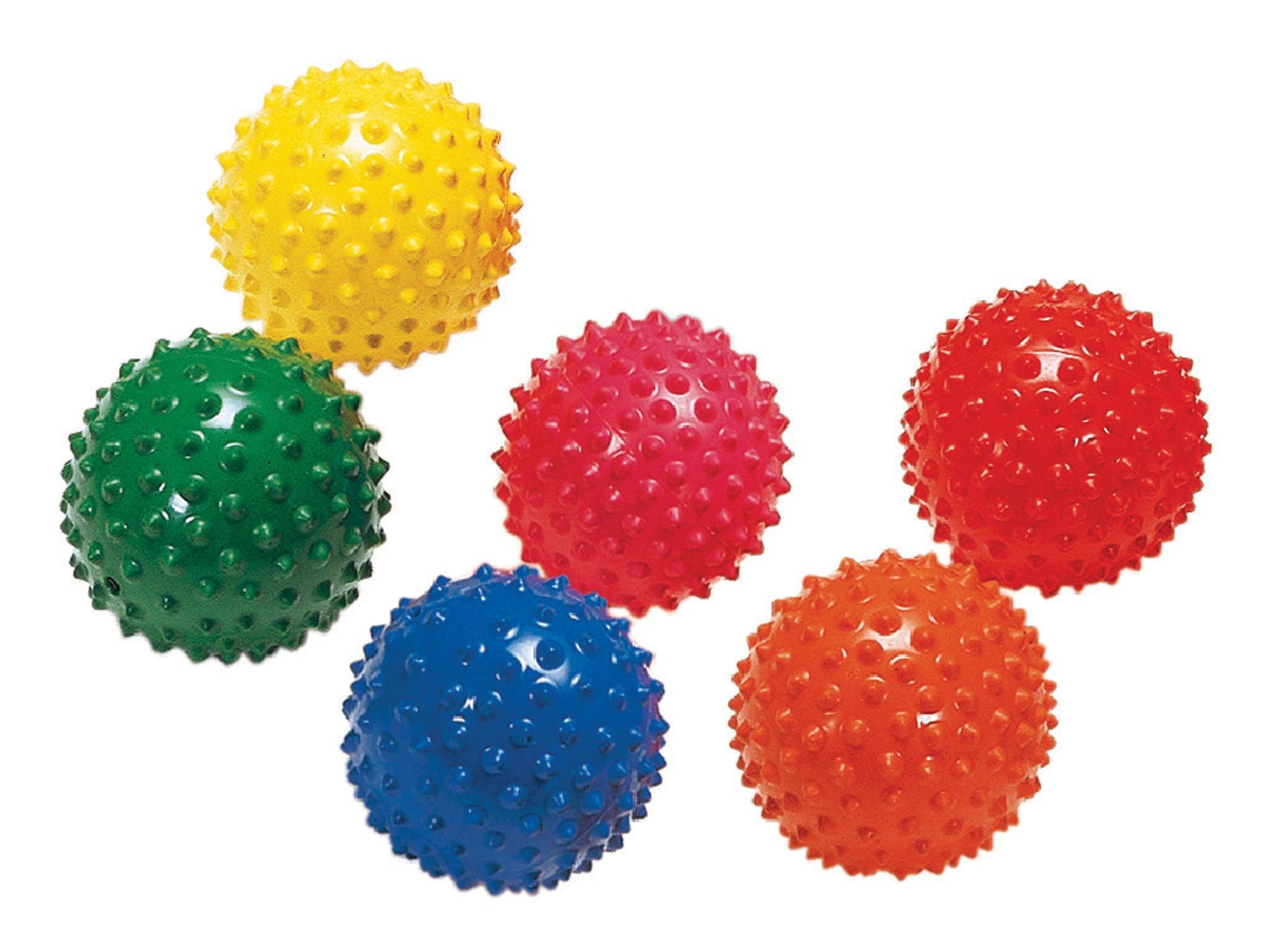 Balles souples au toucher, hérissées de pointes, conçues pour favoriser le jeu de manipulation et la préhension. Lot de 6 balles de ø 12 cm, aux couleurs vives.