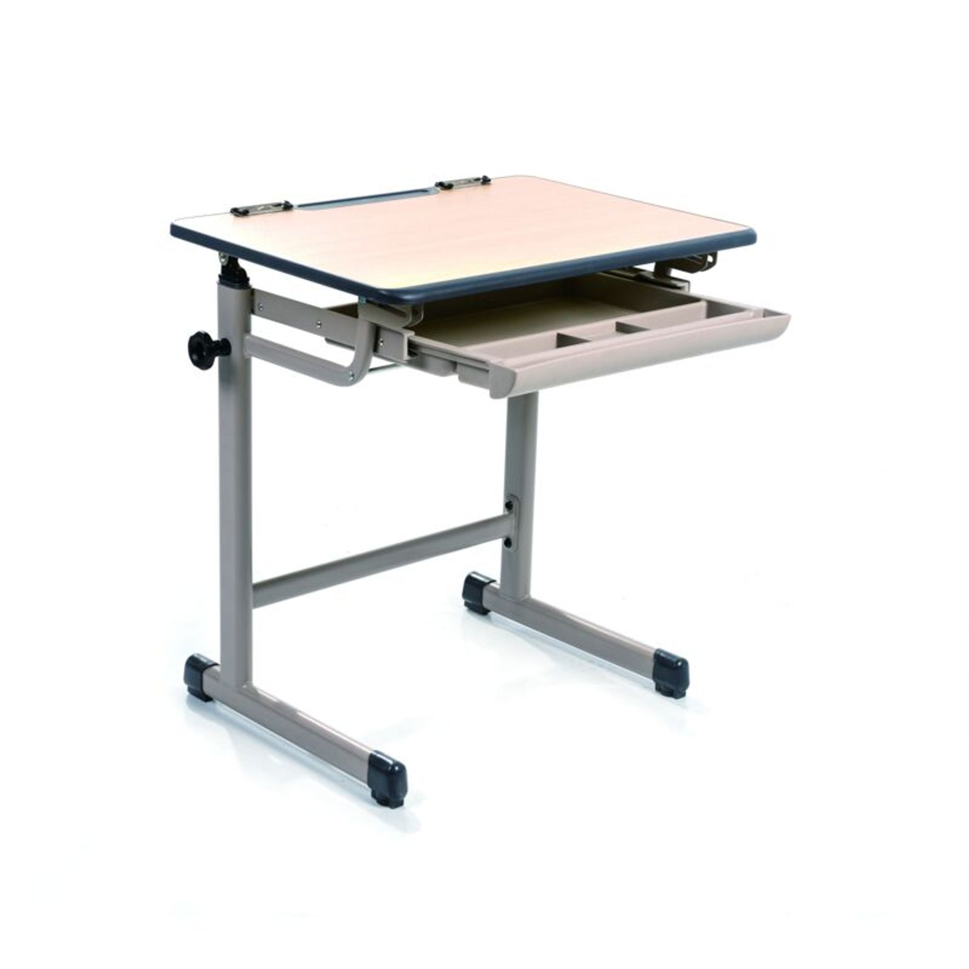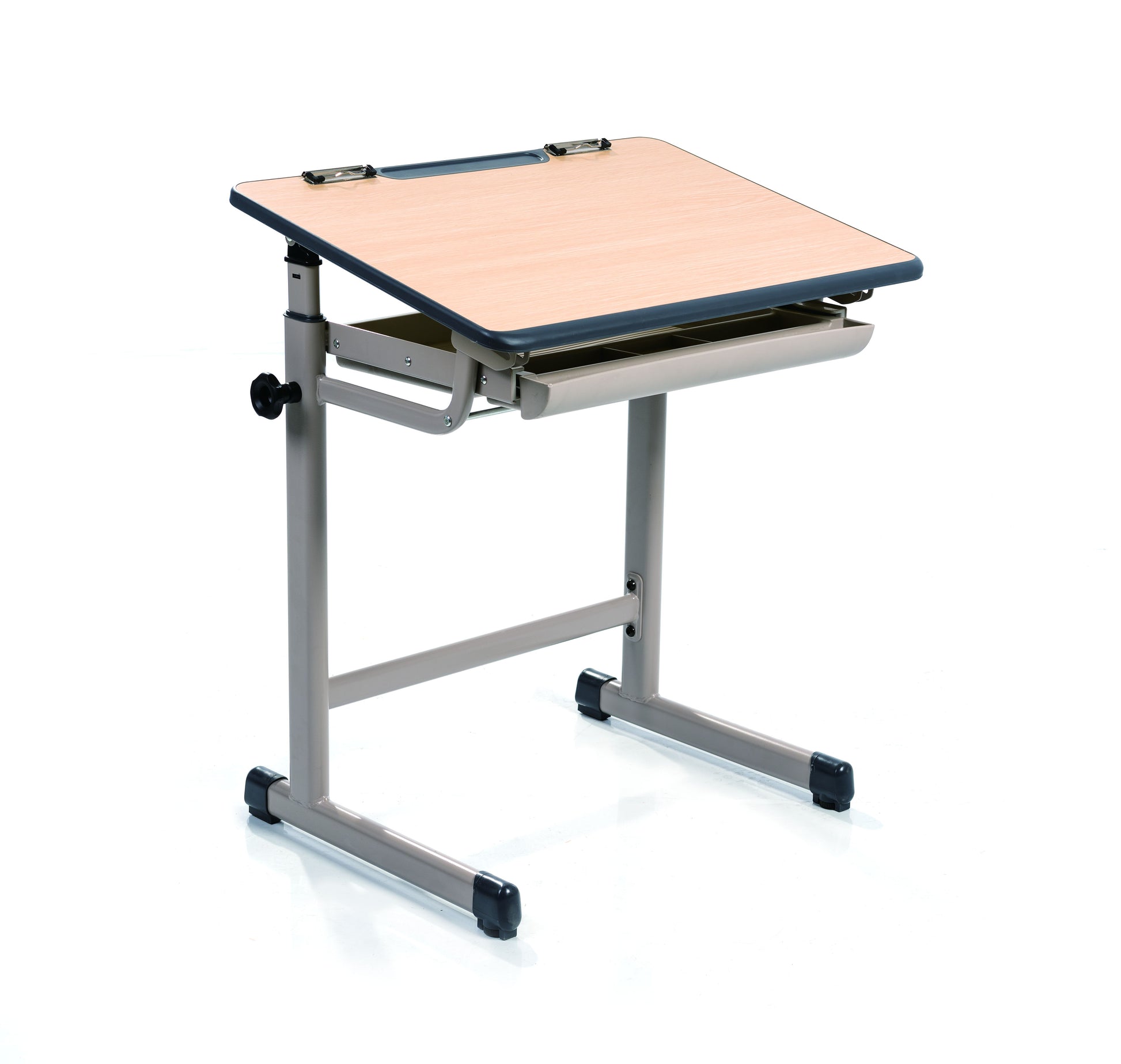 Pupitre inclinable jusqu'à 36o Pinces pour les feuilles et espace pour les crayons. Plateau de rangement coulissant dessous.