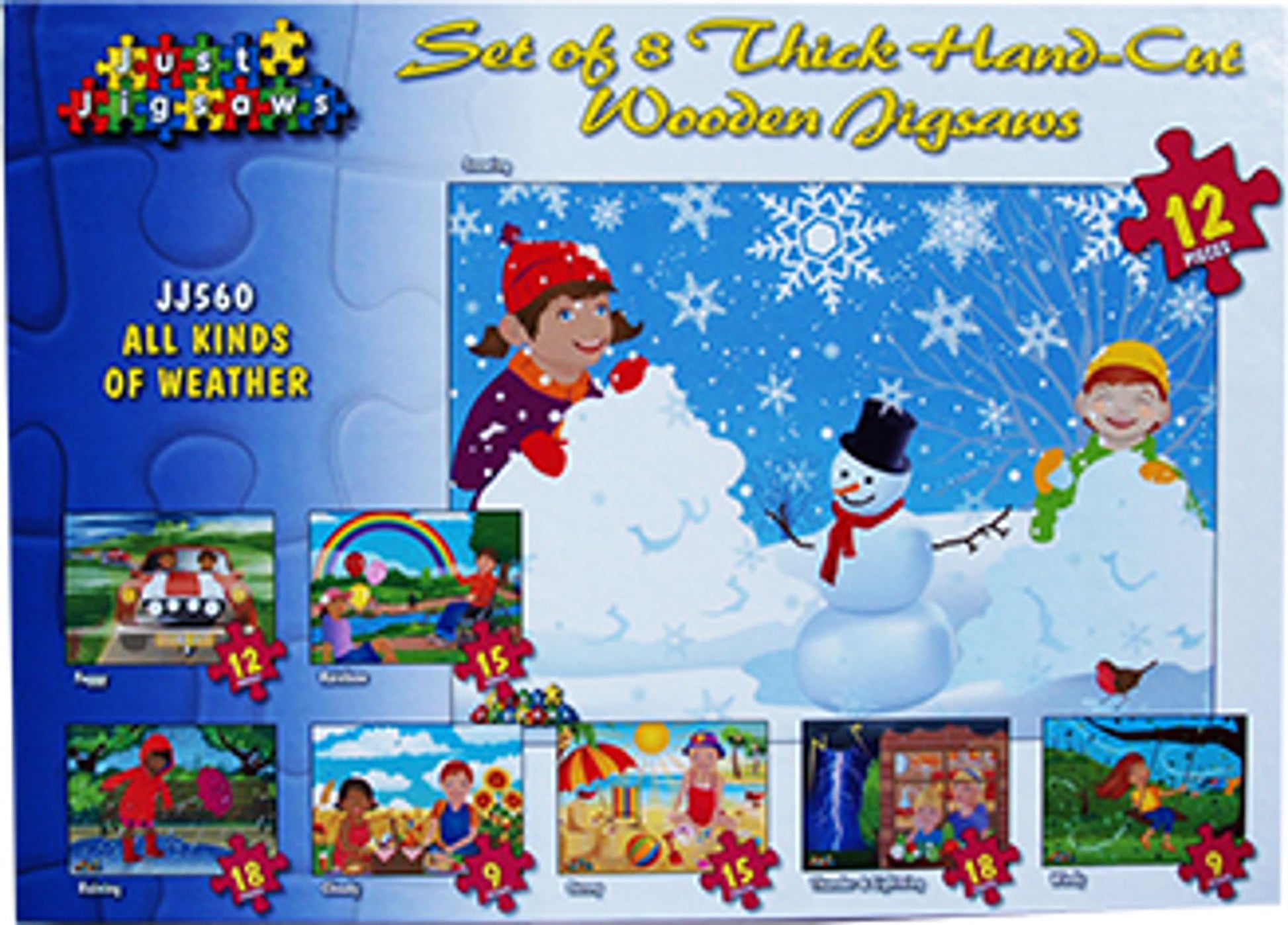 Ensemble de 8 puzzles en bois épais, découpés à la main, de 9 à 18 morceaux. Chaque image illustre des enfants de différentes ethnies (dont un qui est en fauteuil roulant) dans un environnement familier et des conditions climatiques différentes (brume, vent, arc-en-ciel, orage, soleil, pluie, nuages et neige). 20 x 15 cm ch.