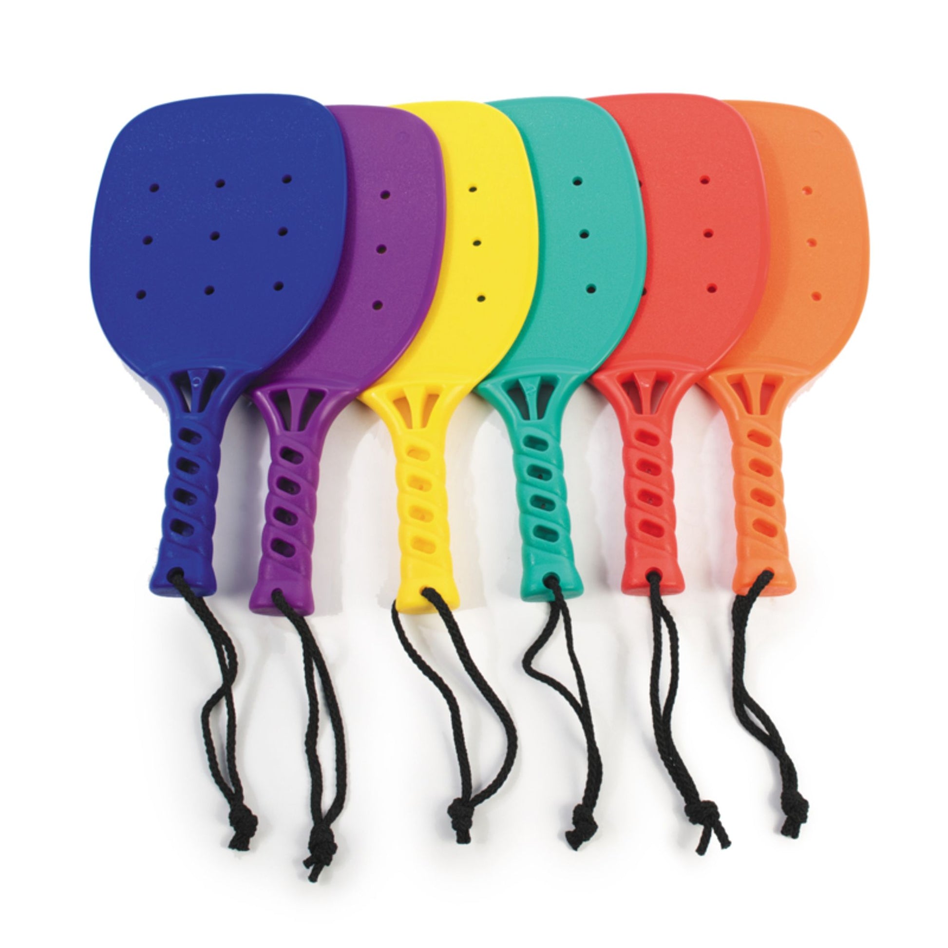 Raquettes pleines de 38,1 cm, réalisées en plastique ABS moulé résistant et percées de 9 trous. Avec sangle de poignet. À utiliser avec différentes sortes de balles, plastique, mousse ou caoutchouc. Ensemble de 6, aux couleurs de l'arc-en-ciel.
