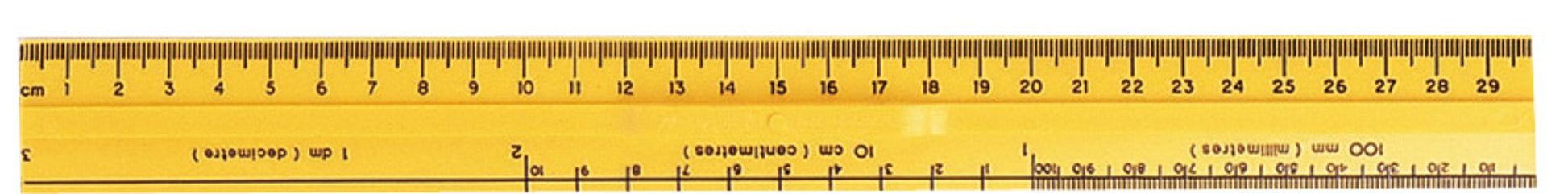 30 cm. Opaque, intermédiaire. Graduée pour montrer la relation entre les dm, les cm et les mm.