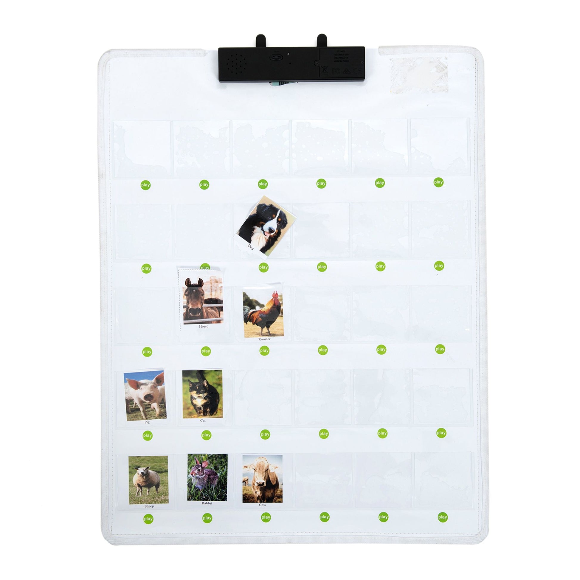 Chacune des 30 pochettes peut enregistrer des messages d'une durée jusqu'à 30 secondes permettant ainsi tellement d'activités ! Facile à utiliser pour les enfants comme pour les enseignants: il suffit d'appuyer sur le bouton vert près de la pochette et de parler dans le microphone du haut ! Un simple interrupteur passant de l'enregistrement à la lecture permet ensuite de rejouer le message en appuyant sur les boutons verts Utilisation extérieure et intérieure. Quelques idées d'utilisations : alphabet, jeux de sons et de rimes, storyboards, quiz, chronologies, identification des formes, tableau des émotions, sommes mathématiques, règles de classe, comptines, instruments de musique, personnages célèbres et bien plus encore. Le tableau en plastique robuste dispose de 2 œillets de fixation murale et de poches en vinyle. Nécessite 3 piles AAA 1,5 V (non incluses).