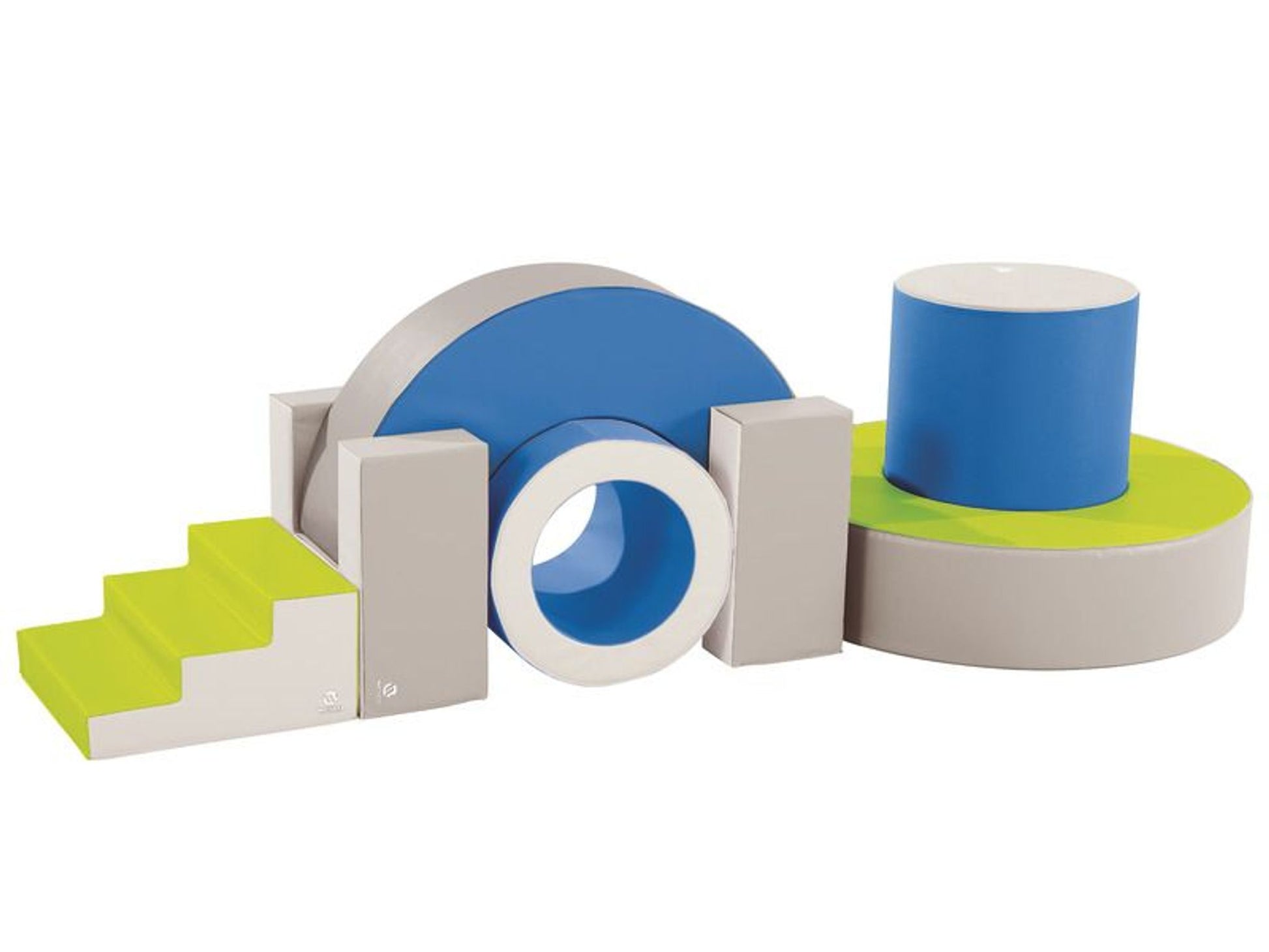 Ensemble Blocmodule comportant • 1 cylindre • 1 grande roue • 1 tonneau • 2 encastrements en u • 1 demi-cercle • 1 trois marches Encombrement au sol : 300 x 120 cm.