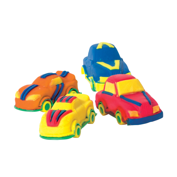 Offre 4 pots de pâte à modeler parfumée sans gluten (bleuet, banane, fraise, lime), 4 châssis sur roues et 2 moules.