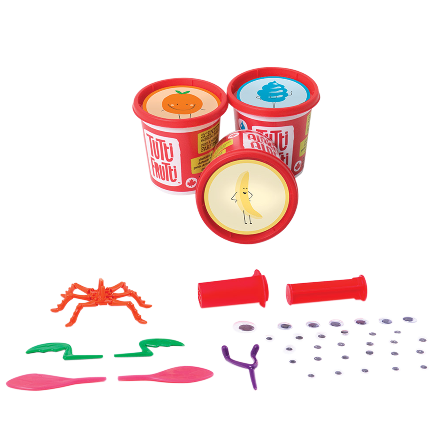 Offre 3 pots de pâte à modeler parfumée (orange, banane, barbe à papa), 1 paire de griffes, 1 paire de pattes, 1 paire d'ailes, 1 paire d'antennes et 1 faisceau d'yeux écarquillés.