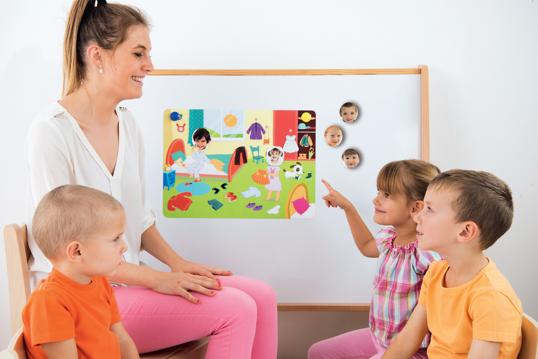 En observant 10 planches illustrées proposant des thèmes de la vie quotidienne et en manipulant 32 jetons magnétiques autocollants à personnaliser avec des photos d'eux-mêmes, les enfants sont spontanément incités à construire des phrases utilisant le pronom personnel adéquat. Ils apprennent progressivement à parler de soi et des autres et à employer différentes structures syntaxiques (affirmatives, négatives, interrogatives).